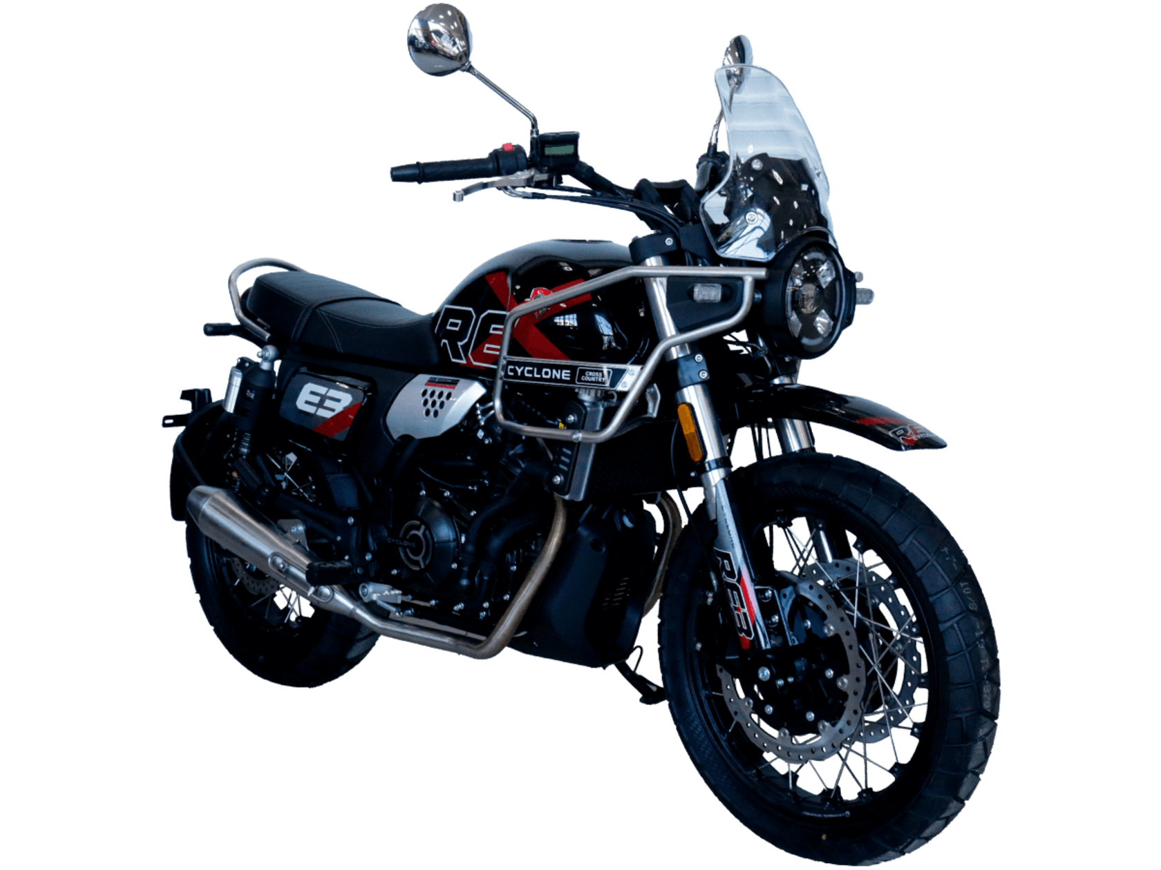 CYCLONE RE3 Scrambler (SR400-A) – универсальный мотоцикл, объединяющий в себе черты городского мотоцикла и эндуро. Управляя им, можно бросить вызов и городским пробкам, и скоростным автострадам, и всевозможному лёгкому бездорожью. Его дизайн отдаёт дань уважения каферейсерской тематике.Двухцилиндровый четырёхтактный двигатель объёмом 401 см3 выдаёт 43 л.с. на 9500 об/мин. Инжекторный впрыск топлива с инжектором BOSCH увеличивает топливную экономичность, а также позволяет добиться высокой приёмистости и неприхотливости агрегата. Жидкостная система охлаждения не допустит перегрева двигателя даже при самом агрессивном вождении. На мотоцикл установлена 6-ступенчатая механическая коробка передач.Максимальная скорость мотоцикла составляет 140 км/ч.Мотоцикл оснащён классическими спицованными колёсами диаметром 17 и 19 дюймов и имеет достаточно большой дорожный просвет – 22 см. С неровностями дороги эффективно справляются телескопическая вилка перевёрнутого типа спереди и маятник с двумя амортизаторами сзади. Ход передней подвески составляет 130 мм, задней – 81 мм. Оба компонента подвески являются регулируемыми. Эффективное и безопасное замедление с любых скоростей обеспечивают гидравлические дисковые тормоза с ABS спереди и сзади.Клиренс мотоцикла составляет 220 мм. Объём топливного бака – 19 л. Снаряжённая масса – 200 кг.На данной модели штатно установлены дуги безопасности, а также имеется бортовой компьютер с цветным дисплеем, USB-порт и подсветка пультов.RE3 Scrambler сочетает в себе отличные технические характеристики, комфорт и надёжность, что позволяет вам ощутить настоящую свободу на любой дороге с любым покрытием.