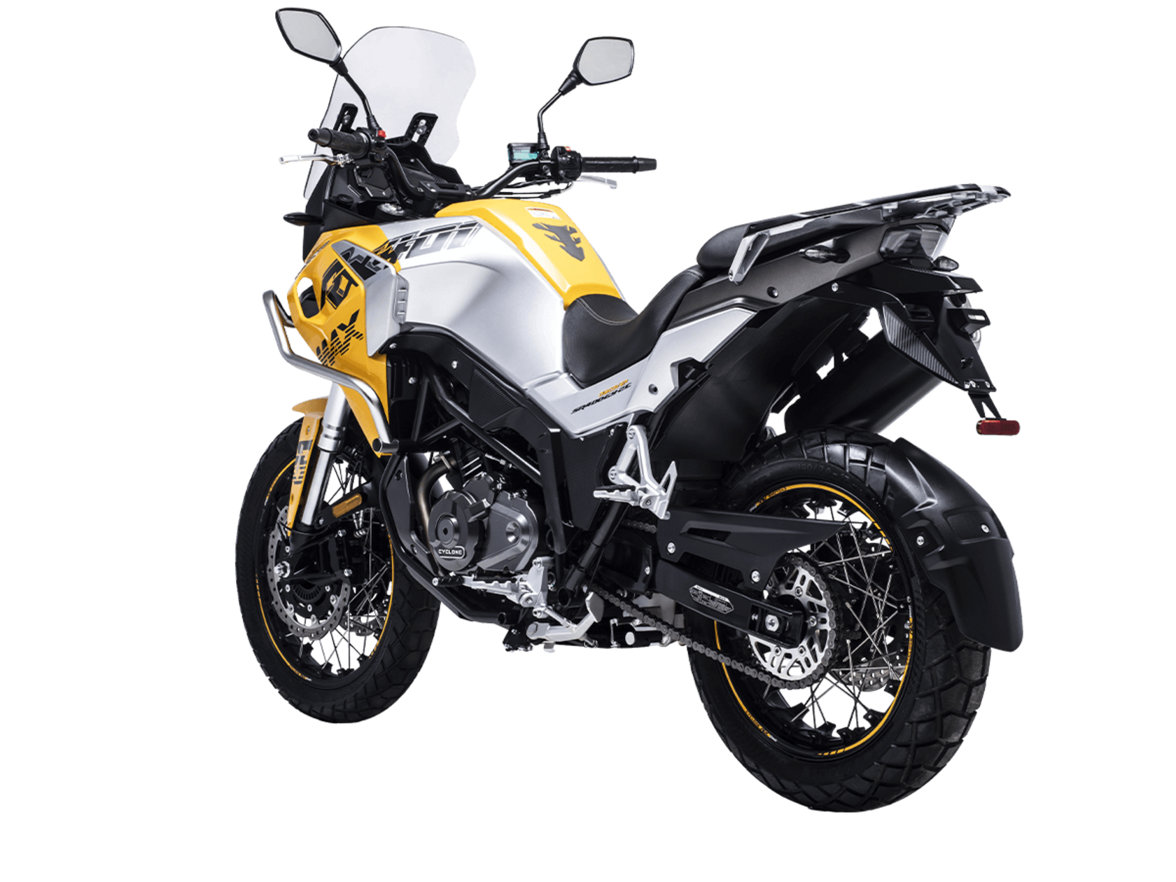 Мотоцикл CYCLONE RX401 2025 – туристический эндуро, готовый бросить вызов любым дорогам и расстояниям. За его рулём для вас не будет невозможных маршрутов!Оснащён рядным 2-цилиндровым 4-тактным двигателем DOHC объёмом 401 см³ с 4 клапанами на каждом цилиндре. Двигатель способен обеспечить мощность в 42,8 л.с. при 9500 об/мин, а максимальный крутящий момент 37 Н·м достигается на 8000 об/мин. Соотношение диаметра цилиндра и хода поршня 68х55,2 мм. Степень сжатия 11,6:1.Жидкостная система охлаждения не допустит перегрева двигателя даже при самом агрессивном вождении. Механическая коробка передач имеет 6 ступеней со схемой 1-N-2-3-4-5-6. Объём топливного бака 20 литров.Максимальная скорость мотоцикла 139 км/ч.Мотоцикл оснащён спицованными алюминиевыми колёсами диаметром 19 дюймов спереди и 17 сзади. Колёса обуты в бескамерные покрышки CST. В качестве передней подвески используется телескопическая вилка перевёрнутого типа, а сзади установлен маятник с моноамортизатором. Ход передней подвески 130 мм, задней – 55 мм. Оба компонента подвески регулируются. Для эффективного торможения используются гидравлические дисковые тормоза с 2-канальной ABS системой. Тормоза спереди представлены 2 тормозными дисками диаметром 305 мм с 4-поршневыми саппортами, а сзади расположен тормозной диск 258 мм с однопоршневым суппортом с плавающей скобой.Мотоцикл имеет продуманную конструкцию с высоко расположенным радиатором.Для освещения и сигнальных огней используется диодная светотехника. Данные от бортового компьютера выводятся на яркий цветной дисплей, оснащённый специальным козырьком для защиты от брызг и бликов. Имеются подсветка пультов, USB-порт, 12-вольтная розетка.Габариты 2160x860x1395 мм, снаряжённая масса 215 кг. Колёсная база 1410 мм, клиренс 185 мм, высота по седлу 810 мм.