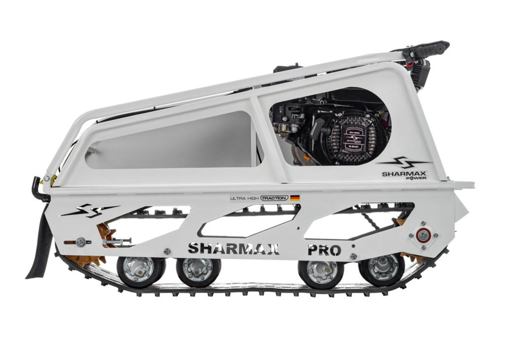 Мотобуксировщик SNOWBEAR S380 1250 HP8 MAXIMUM настоящий помощник на охоте и рыбалке, решит множество задач в сельскохозяйственной деятельности. Идеальное сочетание цены и качества.Гусеница мотобуксировщиков “Sharmax” шириной 380 мм, адаптирована для малогабаритных мотобуксировщиков длиной до 1450 мм. Обладает повышенной стойкостью к износу, а специальная форма протектора дает отличное сцепление с поверхностью, при этом сохраняя уверенную маневренность мотобуксировщика..