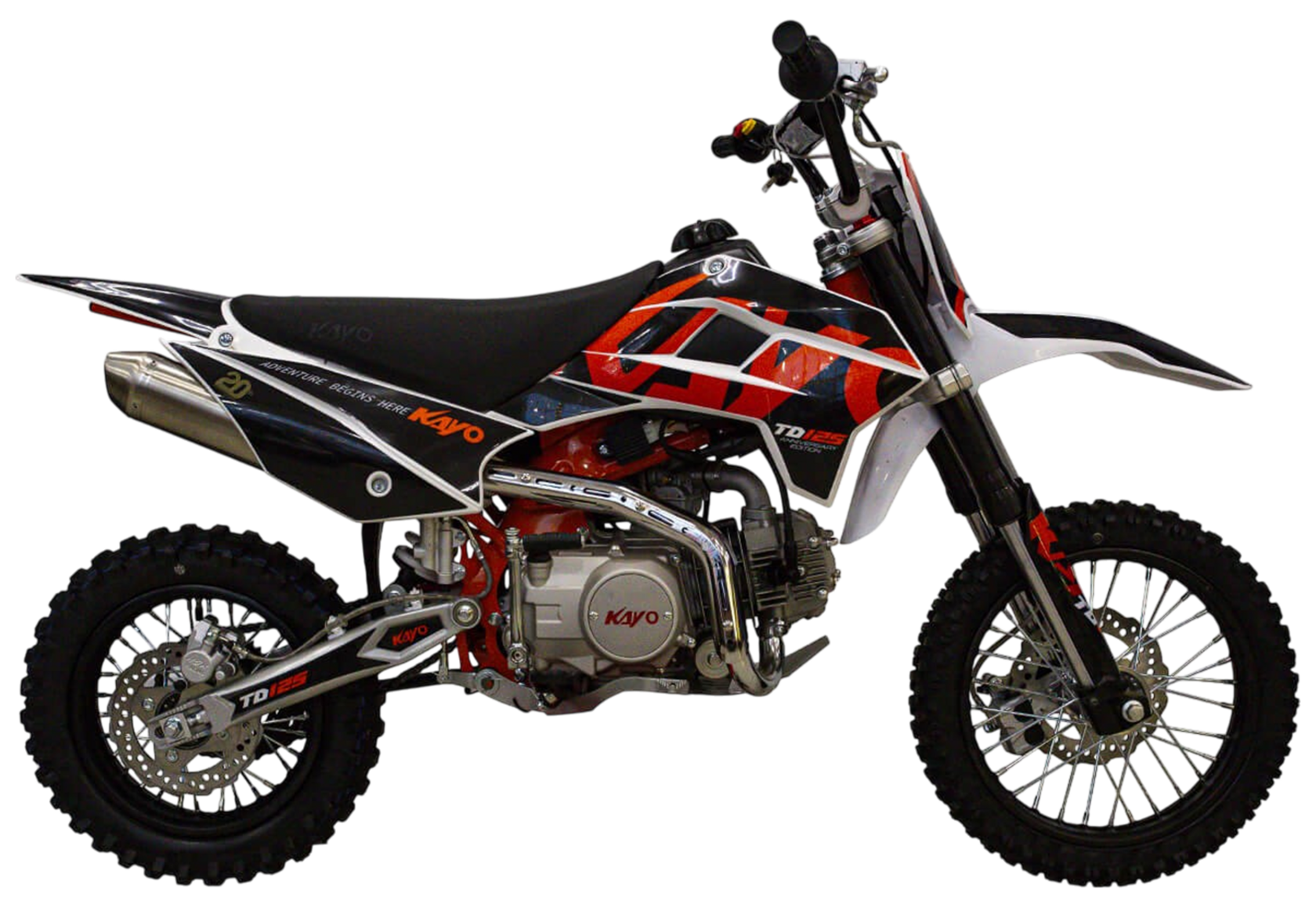 Питбайк KAYO Mini TD125 14/12 – подходящий вариант для смелых ребят от 8 лет. С ним можно научиться основам и контролю скорости на крутых спусках или сыпучих грунтах. Можно использовать и на лёгких кроссовых трассах, и на более сложных рельефах.Одноцилиндровый 4-тактный двигатель воздушного охлаждения ZONGSHEN ZS154FMI объёмом 124 см3, выдаёт 9 л.с. Карбюратор NIBBI PE19 обеспечивает бесперебойную работу техники в самых жёстких условиях эксплуатации, простоту и лёгкость в обслуживании, а также неприхотливость к качеству топлива. Питбайк оснащён полуавтоматической 4-ступенчатой коробкой передач с формулой “N-1-2-3-4”. Сцепление тут выжимать не нужно – переключение происходит под сброс газа, что позволит начинающим райдерам меньше отвлекаться и больше сосредоточиться на управлении питбайком.Аппарат имеет вес всего 65 кг и большой клиренс – 265 мм. Усиленная рама из хром-молибденового сплава и подвеска позволяют эффективно амортизировать удары при езде по неровностям и препятствиям на трассе. Передняя подвеска — телескопическая вилка перевёрнутого типа длиной 660 мм, задняя — моноамортизатор длиной 310 мм. Рама и пластик являются собственной разработкой производителя. Мотоцикл оснащён классическими стальными спицованными колёсами диаметром 14 дюймов спереди и 12 дюймов сзади. Эффективное и безопасное замедление с любых скоростей обеспечивают гидравлические дисковые тормоза марки HSK.Высококачественная износостойкая резина с развитым протектором отлично держит дорогу на различных типах покрытия. Байк оснащён системой запуска двигателя при помощи кнопки электростартера или при помощи рычага кик-стартера. Питбайк имеет вместительный топливный бак на 5,5 л, что гораздо больше, нежели у других байков этого класса.Если вы ищете послушный, компактный, шустрый, красивый питбайк для своего малыша, считайте, что вы его нашли. Это один из лучших мотоциклов для обучения и первых шагов в эндуро и мотокроссе. Он отлично подойдёт как для гонок на трассе, так и для покатушек по пересечённой местности.