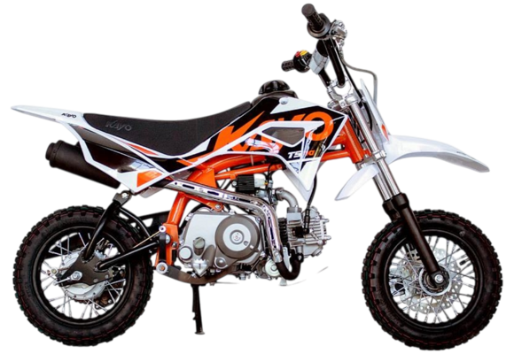 Питбайк KAYO Mini TS70 10/10 – идеальный снаряд для юных экстремалов, который можно использовать на лёгких кроссовых трассах и дорогах с различным покрытием. Удобный, простой и надёжный мотоцикл, который полностью оправдывает свою цену.Одноцилиндровый 4-тактный двигатель воздушного охлаждения YX1P47FMD объёмом 72 см3, выдаёт 5 л.с. Карбюратор JK PZ19 обеспечивает бесперебойную работу техники в самых жёстких условиях эксплуатации, простоту и лёгкость в обслуживании, а также неприхотливость к качеству топлива. Питбайк оснащён автоматической коробкой передач, что позволит райдерам полностью сосредоточиться на управлении питбайком.Аппарат имеет вес всего 52 кг. Усиленная рама из хром-молибденового сплава и подвеска позволяют эффективно амортизировать удары при езде по неровностям и препятствиям на трассе. Передняя подвеска – телескопическая вилка длиной 540 мм, задняя – моноамортизатор 255 мм. Рама и пластик являются собственной разработкой производителя. Мотоцикл оснащён классическими стальными спицованными колёсами диаметром 10 дюймов. Эффективное и безопасное замедление с любых скоростей обеспечивают гидравлический дисковый тормоз спереди и барабанный – сзади. Высококачественная износостойкая резина с развитым протектором отлично держит дорогу на различных типах покрытия. Байк оснащён системой запуска двигателя при помощи кнопки электростартера.Если вы ищете послушный, компактный, шустрый, красивый питбайк для своего малыша, считайте, что вы его нашли.
