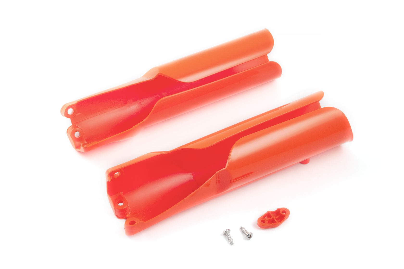 Универсальные защитные накладки на вилку оранжевого цвета полного охвата (360). Обеспечивают максимальную защиту перьев вилки от механических повреждений, грязи, песка и абразивного износа. Изготовлены из ударопрочного пластика. Полный аналог оригинальной детали KTM. Подходят для вилок диаметром 48 мм различных производителей (HT, WP, MNT). Прямая установка без доработок.