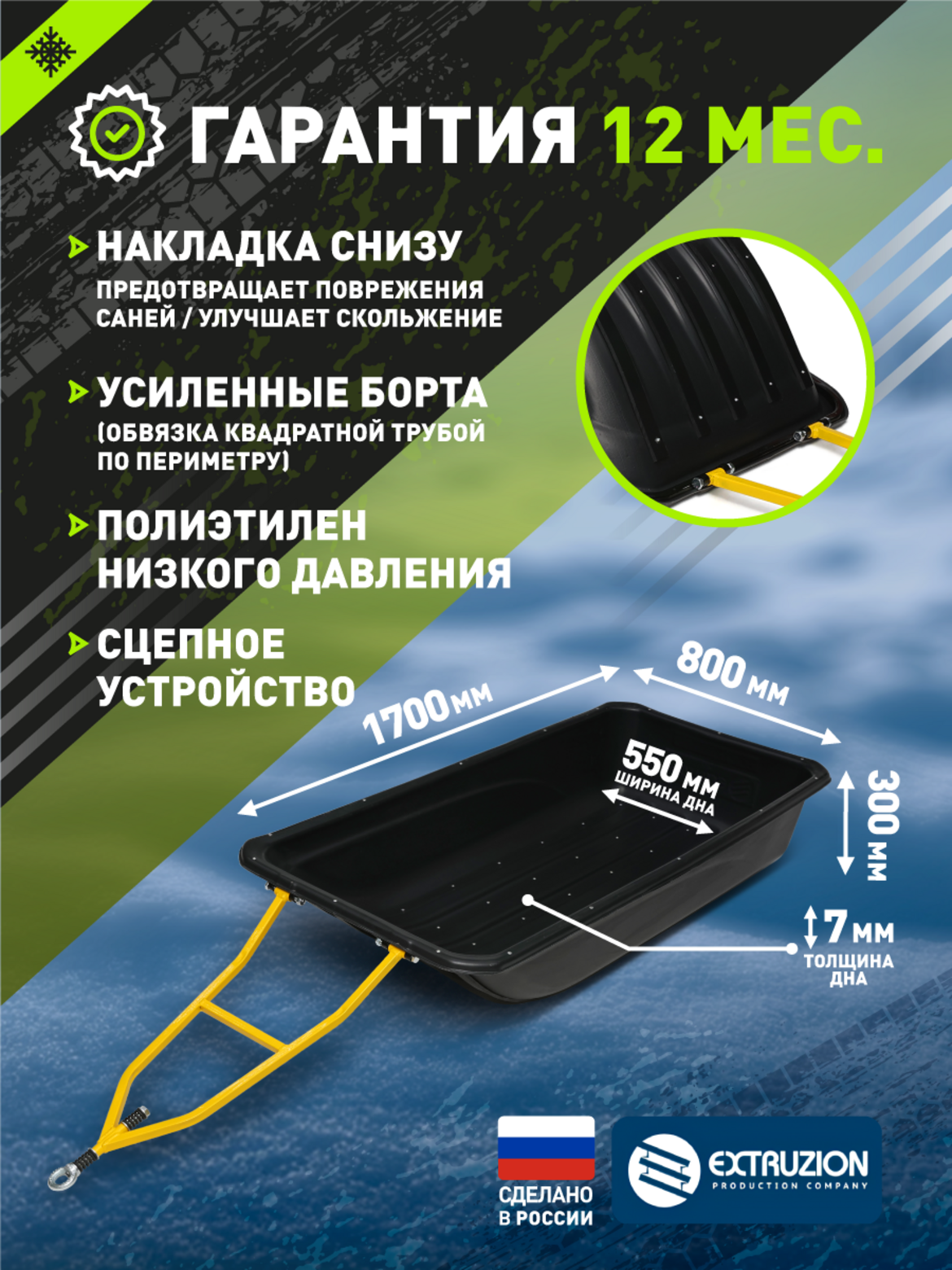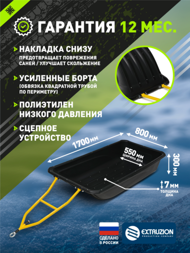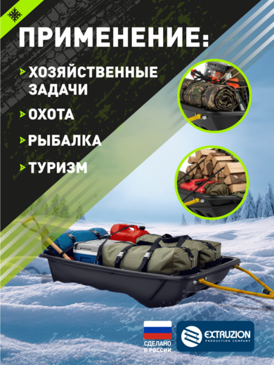 • Крупногабаритные сани-прицеп для профессионального использования с снегоходами и мотобуксировщиками. Один из самых вместительных вариантов в линейке для перевозки объемных грузов. Изготовлены из сверхпрочного ПНД с УФ-стабилизацией. Полная комплектация сцепным устройством и стропами обвязки.