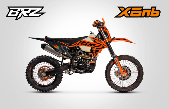 BRZ X6nb выполнен в дизайне KTM 2020-2022. Особую индивидуальность подчеркивает применение разного цвета пластика на передней и задней части мотоцикла. Задняя часть у всех моделей черного цвета. Передняя же часть выполнена в собственной цветовой схеме. Также получила новый дизайн фара головного света. Она стала пятидиодная с нижней «ресничкой». Особое внимание уделено наклейкам. В дизайне графики использованы новые технологии, которые позволили сделать отдельные элементы с зеркальным эффектом. Цвета всех элементов подобраны таким образом, чтоб мотоцикл был внешне максимально гармоничным и законченным.Особое внимание уделено сборке мотоциклов. Во всех мотоциклах BRZ с завода залито масло Motul 7100 10w40. Применяются влагозащищенные разъемы проводки. Все подшипники обработаны специальной консистентной смазкой. Вам больше не нужно тратить дополнительные деньги и время на подготовку мотоцикла к эксплуатации.