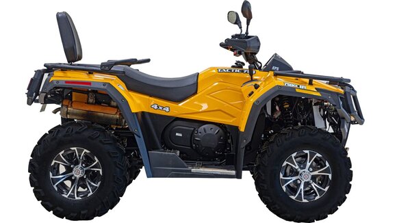 Квадроцикл HISUN TACTIC 750 LIMITED — многофункциональный вездеход с автомобильным рулевым управлением и посадкой. Разработан для эксплуатации в тяжелых условиях бездорожья. Укомплектован стальной сварной трубчатой рамой, пластиковыми обвесами с расширителями арок, передней лебедкой, двумя вместительными багажниками весом до 55 кг. Незаменим для походного туризма. Яркие LED – фары отлично освещают дорогу и гарантируют безопасность передвижения в темное время суток. Крупный протектор колес даст хорошее сцепление с грунтом. Продуманная эргономика обеспечивает высокий комфорт как для водителя, так и для пассажира, а вместительный бензобак на 17 литров и небольшой расход топлива позволит увеличить расстояния Ваших путешествий.