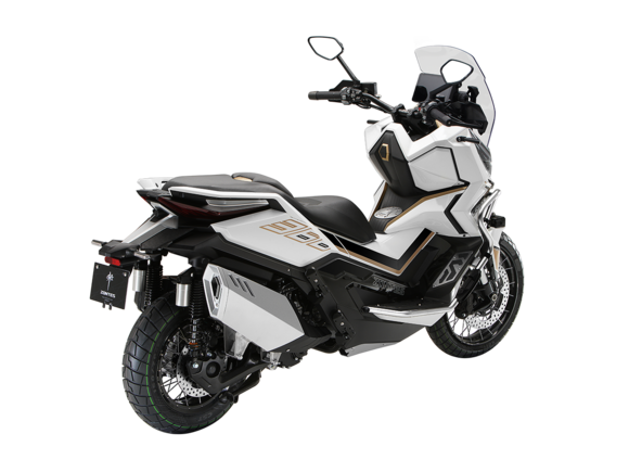 Скутер ZONTES ZT368-G – максискутер двойного назначения, готовый пронестись по улицам города за его пределы и отправиться по грунтовым тропам прокладывать свой маршрут туда, куда вам потребуется. Регулируемая подвеска с перевёрнутой телескопической вилкой спереди обеспечит отличную управляемость и устойчивость в любых условиях.Силовая установка представлена одноцилиндровым 4-тактным двигателем. Двигатель имеет объём 368 см³ и обеспечивает мощность в 38,8 л.с. Оснащён инжектором BOSCH, системой жидкостного охлаждения и вариатором. Запуск двигателя осуществляется с помощью бесключевого доступа.Ёмкость топливного бака 17,5 литра.Колёса имеют диаметр 17 дюймов спереди и 14 дюймов сзади. Для подвески спереди используется телескопическая вилка перевёрнутого типа, а сзади установлены 2 гидравлических амортизатора. Гидравлические дисковые тормоза произведены компанией J.JUAN, входящей в холдинг BREMBO. Мотоцикл также оснащён 2-канальной ABS-системой, противобуксовочной системой TCS System и датчиками давления в шинах.ZT350-G оборудован яркой LED-фарой, мультимедийной приборной панелью с TFT-дисплеем, имеются 2 USB-порта.Габариты скутера 2230х925х1290 мм. Колёсная база 1560 мм. Высота по седлу 795 мм. Вес 198 кг.