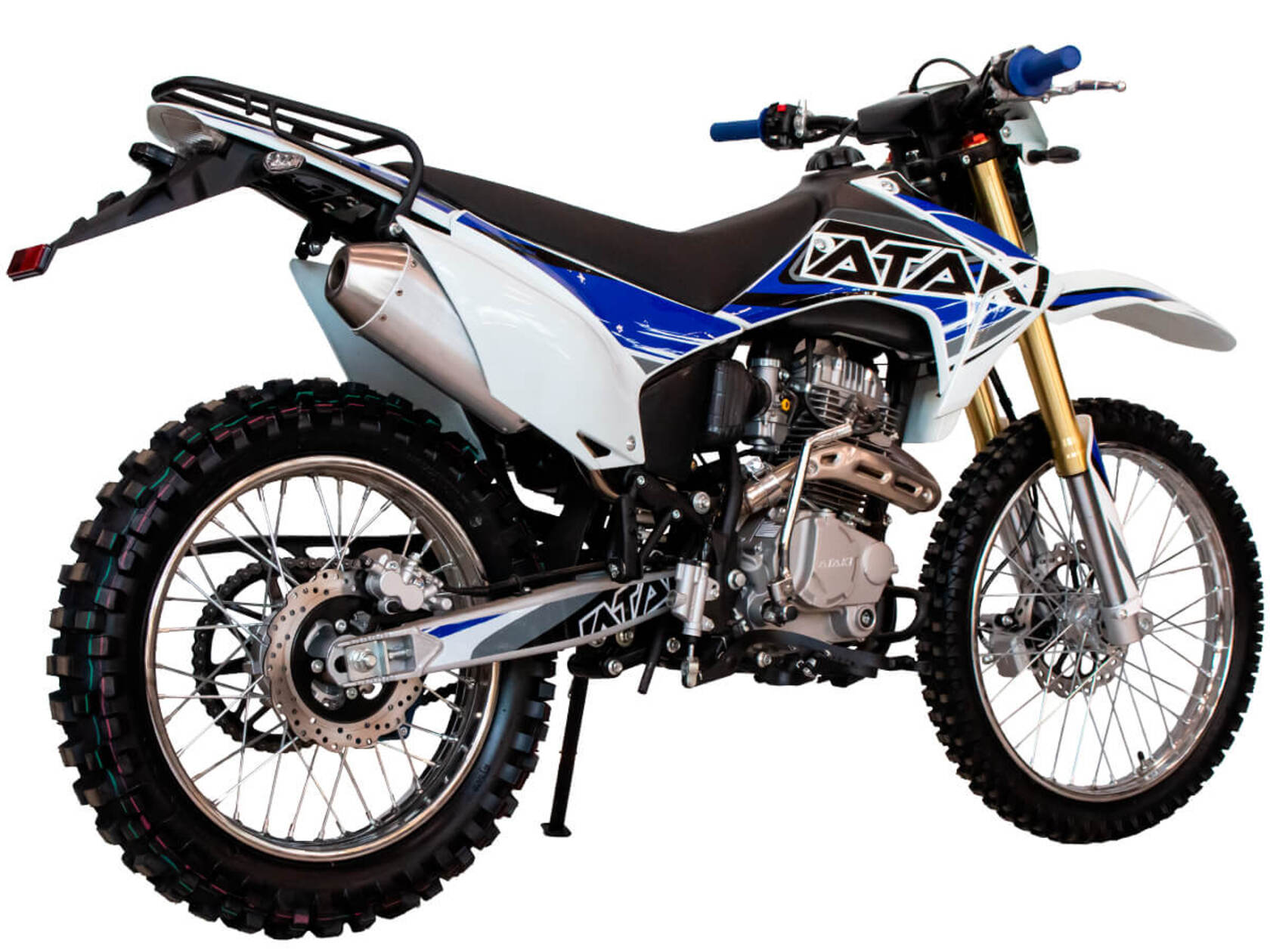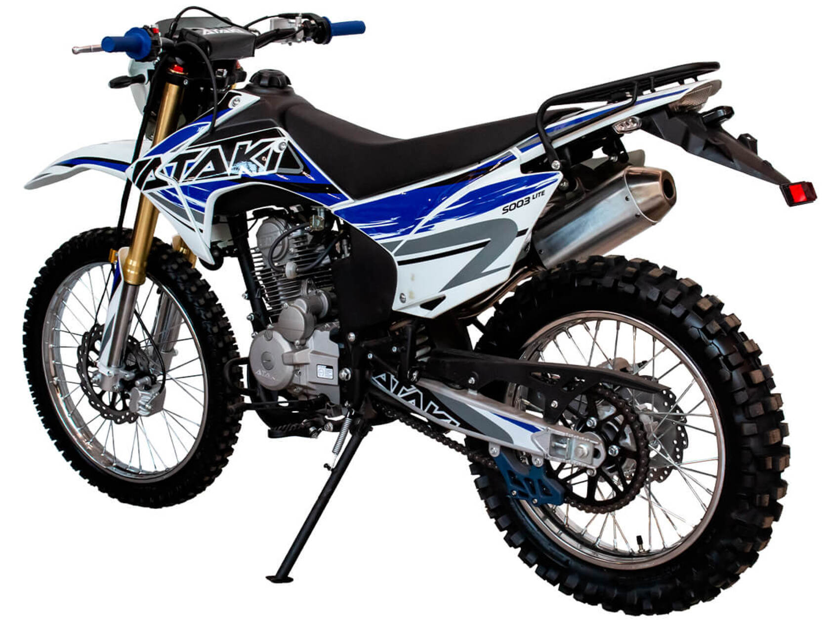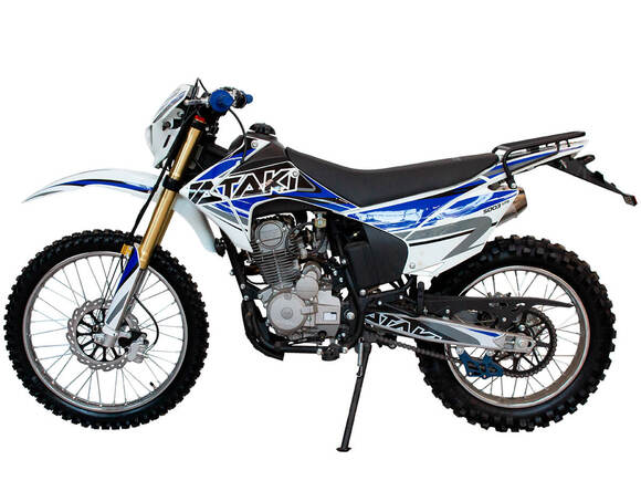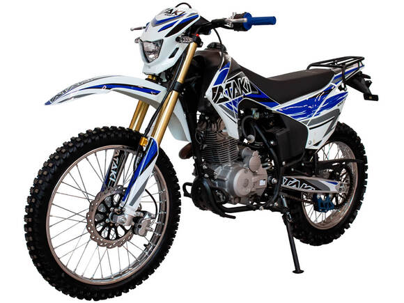 Кроссовый мотоцикл ATAKI S003 Lite 250 (4T CB250-G) – отличный снаряд для внедорожного экстрима, представляющий собой оптимальный баланс производительности и технической оснащённости, поэтому он идеально подходит как новичкам, так и опытным райдерам. Удобный, простой и надёжный мотоцикл, который полностью оправдывает свою цену.Мотоцикл оснащён одноцилиндровым 4-тактным двигателем воздушного охлаждения (ZONGSHEN ZS165FMM) объёмом 223 см3, который обеспечивает мощность в 17 л.с., что позволяет развивать большую скорость и с лёгкостью преодолевать трассы со сложным рельефом. Карбюратор NIBBI PE30 обеспечивает бесперебойную работу техники в самых жёстких условиях эксплуатации, простоту и лёгкость в обслуживании, а также неприхотливость к качеству топлива. Двигатель работает в паре с 5-ступенчатой механической коробкой передач с классической схемой “1-N-2-3-4-5”. Передняя подвеска — нерегулируемая телескопическая вилка перевёрнутого типа длиной 830 мм, задняя — нерегулируемый моноамортизатор 370 мм. Мотоцикл оснащён классическими спицованными колёсами диаметром 18 и 21 дюйм. Эффективное и безопасное замедление с любых скоростей обеспечивают гидравлические дисковые тормоза.Высококачественная износостойкая резина с развитым протектором отлично держит дорогу на различных типах покрытия и в самых разных поворотах. Благодаря удобным подножкам и сиденью эргономичной формы, покрытому антискользящим материалом, на мотоцикле комфортно ездить вдвоём. Объём топливного бака составляет 9 л, чего с успехом хватает для длительных сессий.Модель оснащена задним багажником-решёткой и эргономичными зеркалами заднего вида. Наличие яркой светодиодной фары позволяет кататься в тёмное время суток.Мотоцикл имеет ПТС и весь необходимый комплект светотехники, позволяющий ездить по дорогам общего пользования.ATAKI S003 Lite 250 (4T CB250-G) сочетает в себе отличные технические характеристики, комфорт и надёжность, что позволяет вам ощутить настоящую свободу на любой трассе.