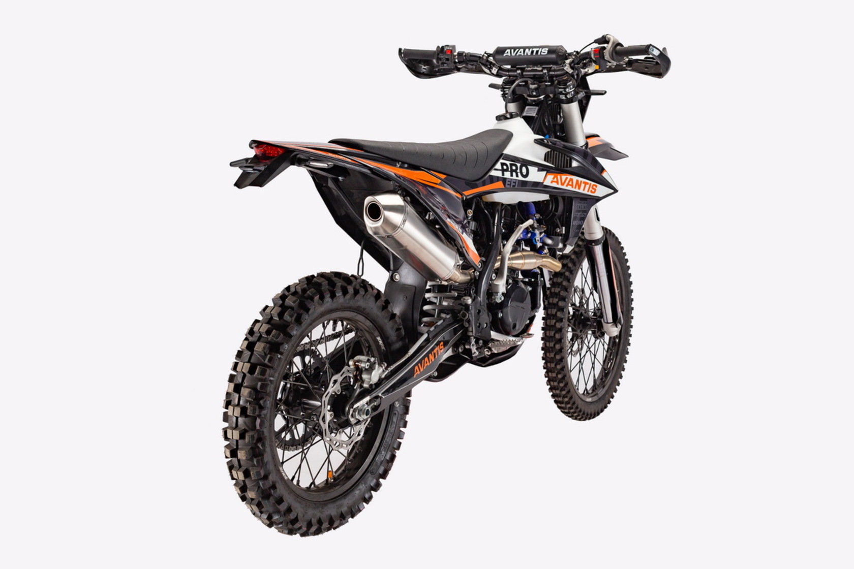 Мотоцикл Avantis Enduro 250 DOHC PRO EFI Exclusive (NC250/177MM) ARS – свежая модель 2022 года, отлично подходит для профессионального и любительского мотокросса.Четырехтактный инжекторный двигатель на 250 кубов с жидкостным охлаждением выдает внушительные 37 л.с., коробка передач механическая на 6 ступеней, надежная в работе и простая в ремонте. Завод производится кик-стартером или электростартером. Тормоза дисковые гидравлические, шланги для передних армированные, они не повредятся при езде по пересеченной местности.В нижней части двигатель закрыт защитной пластиной, предохраняющей его от повреждения ветками и камнями. Широкие крылья и задние щитки из гибкого пластика не ломаются и надежно закрывают ездока, в том числе от получения ожогов от горячих частей. Рычаги сцепления и тормоза складываются, при транспортировке эта функция очень полезна.Амортизаторы ARS полностью регулируемые – и передняя перевернутая телескопическая вилка, и задний маятниковый моноамортизатор, неровности дороги ездок замечает по минимуму. Даже на самом труднопроходимом грунте резина с глубоким рисунком хорошо цепляется, и не прокручивается благодаря буксаторам.
