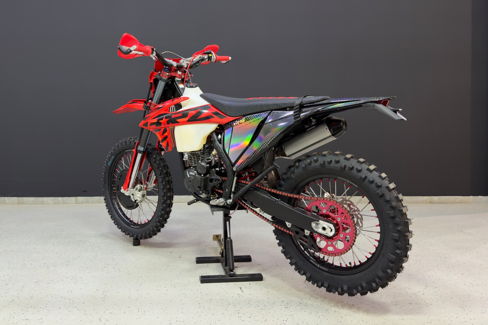 Мотоцикл BRZ X5S 2023 года - полноразмерный эндуро мотоцикл. Он специально создан для райдеров, которые уже выросли из питбайка и хотят раздвинуть свои пределы.Он подойдет и начинающим эндуристам с ростом от 175 см. X5S идеально себя чувствует в лесных прохватах с преодолением различных препятствий благодаря небольшому весу, тяговитому двигателю и большим колесам 21/18.Мотоцикл максимально упрощен для большей надежности. Из электрики он снабжен светодиодной фарой, электростартером. Установлен двигатель Zongshen ZS172FMM-7 4V с балансировочным валом. По сути в нем просто нечему ломаться, можно смело ездить в лесные мото походы на 40 - 200 км. Инженеры BRZ moto учли все ошибки конкурентов и снабдили мотоцикл качественными подвесками и алюминиевыми ободами Enduro X-Series. Был переработан узел верхнего крепления двигателя к раме, избавивший от повышенных вибраций. Ведомую звезду закрепили на 6 потайных болтов. Ну и не стали экономить на карбюраторе - в базе установленNIBBI RACING BLACK PWK32! Подведя итог можно смело заявить что X5S - идеальный выбор для тех, кто хочет купить настоящий мотоцикл!