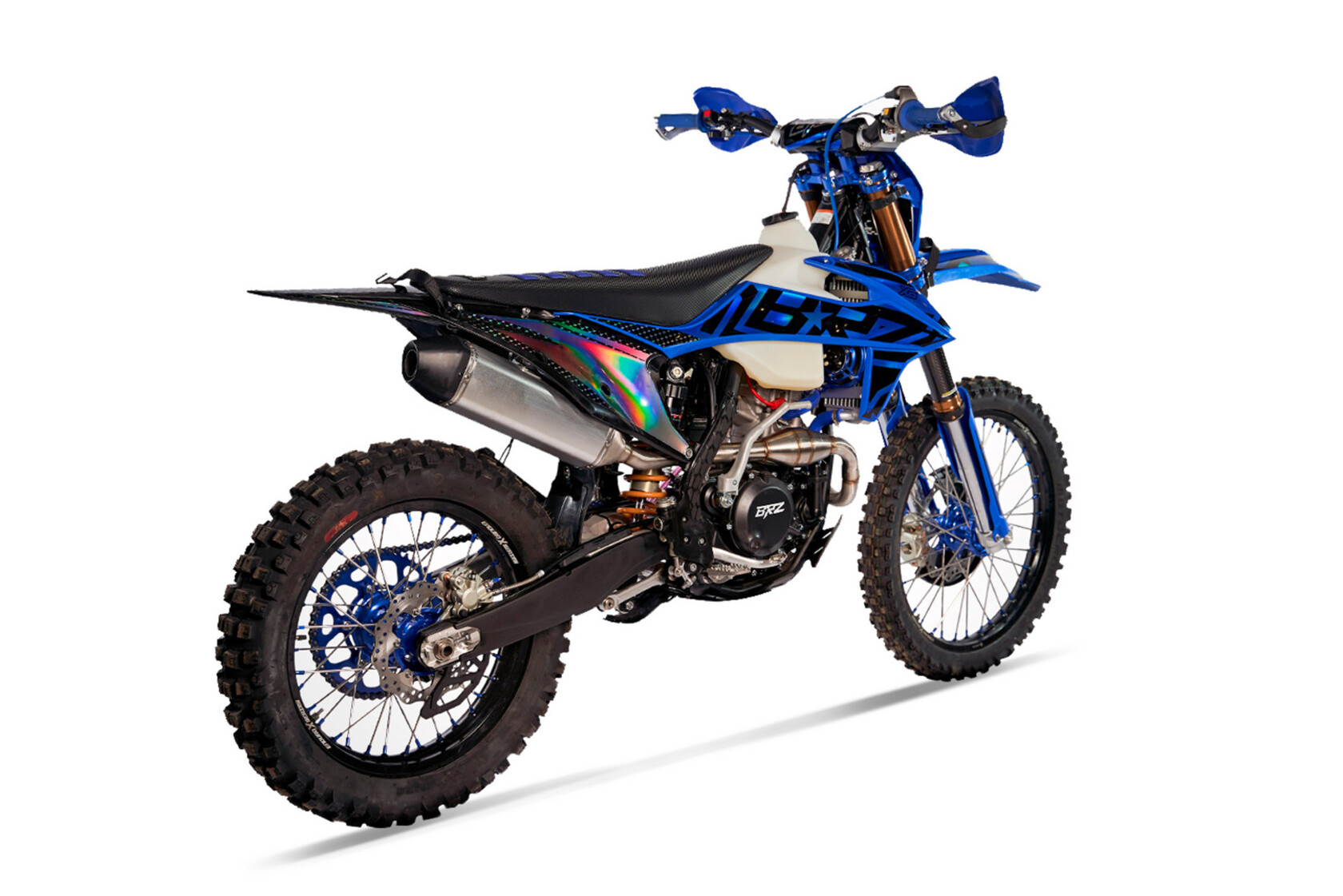 Мотоцикл BRZ X6 идеально себя чувствует в эндуро и кантри кросс дисциплинах. Идеально зайдет после владения «воздушкой». Сочные низа дают уверенность при преодолении сложных препятствий и подъемов с переставками. С газа поднимает на заднее колесо на любой передаче!За основу мотоцикла взят двигатель NC300 (ZS177FMM).В паре с двигателем установлен карбюратор NIBBI PWK 34 Black, надежный и неприхотливый в эксплуатации.Выхлопная системаДля реализации всего потенциала двигателя на BRZ X6 применена тюнингованная выхлопная система. Изменили приемную трубу.Чтобы передавать всю мощность двигателя на трансмиссию была доработана система сцепления. Установлены усиленные японские диски (железные и фрикционные) от японского бренда F.C.C. Также применена крышка сцепления со встроенной дополнительной форсункой, через которую подается масло и дополнительно охлаждает и смазывает пакет дисков. Эта система продляет срок службы сцепления, дает возможность преодолевать сложные препятствия, где нужно «травить» сцеплением. Для облегчения выжима применены специальные тросы с уменьшенным трением за счет специальной полиуретановой оболочки стального троса, а также специальный переходной кронштейн легкого выжима.Радиаторы системы охлаждения надежно защищены алюминиевой рамкой с распорными втулками. На правом радиаторе в базе установлен вентилятор, также упакованный в алюминиевую защиту, чтобы в критический момент он не вышел из строя. Резиновые шланги были заменены на силиконовые, они лучше справляются с температурой и не высыхают со временем.Все полноразмерные модели BRZ построены на новой раме K8. Она сделана по подобию рамы KTM 2017-2022 года. Благодаря стальной легкой раме мотоцикл получил правильную развесовку, он лучше рулится в поворотах и более стабилен на больших скоростях. С передней части рамы установлена алюминиевая защита двигателя.Подрамник выполнен из алюминия. Легкий и прочный, в отличии от пластикового, выдерживает падения или нежелательного сальто, его можно выправить в случае деформации.В паре с новой рамой используется новый маятник. Он производится по гравитационной технологии литья, что дает высокую жесткость на скручивание. С завода маятник одет в пластиковую защиту. Она возьмет на себя все царапины и удары. Если захотите вернуть свой мотоцикл к заводскому внешнему виду – просто обновите защиты.На BRZ X6 применяются усиленные ступицы, которые сделаны из единого куска алюминия, обработанного на ЧПУ станке (CNC). 4мм усиленные спицы, алюминиевые обода «Enduro X series» из авиационного алюминия 7075.Покрышки на мотоцикле бренда «GEMA». Задняя покрышка шириной 140мм Super Soft. Теперь не нужно менять покрышки на новом мотоцикле!BRZ X6 получил подвеску MNT. Передняя вилка с картриджем закрытого типа. Диаметр зеркала 48мм. Вилка полностью регулируемая на отбой и сжатие. Задний амортизатор MNT с выносным бачком также имеет регулировки скорости отбоя и сжатия, плюс к этому есть возможность регулировки медленного сжатия за счет дополнительного перепускного клапана. Подвеска успешно справляется с большими нагрузками на скоростных кроссовых треках с высокими прыжками. Также ее можно расслабить для эндуро.CNC траверсы выполнены из авиационного алюминия 7075. Выдерживают большие нагрузки, легкие и прочные.Тормоза полностью повторяют по конфигурации Brembo. Предсказуемо и н