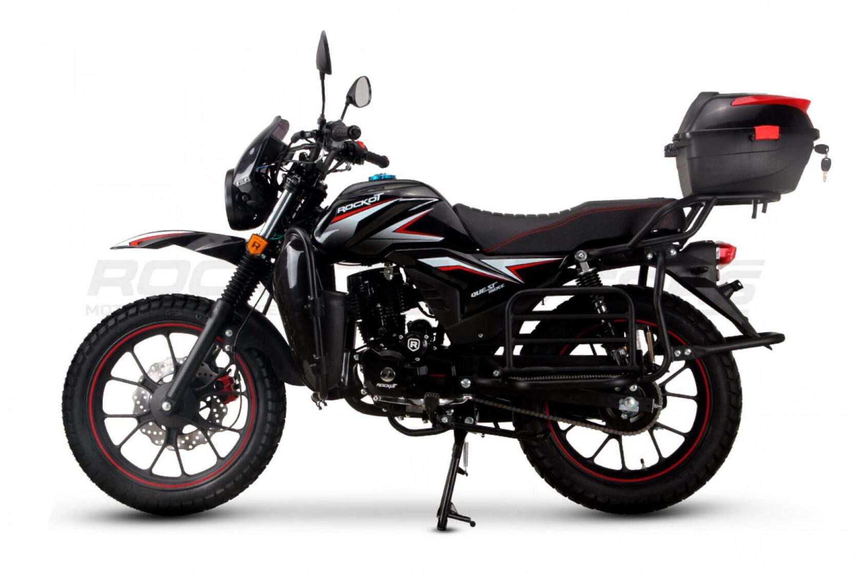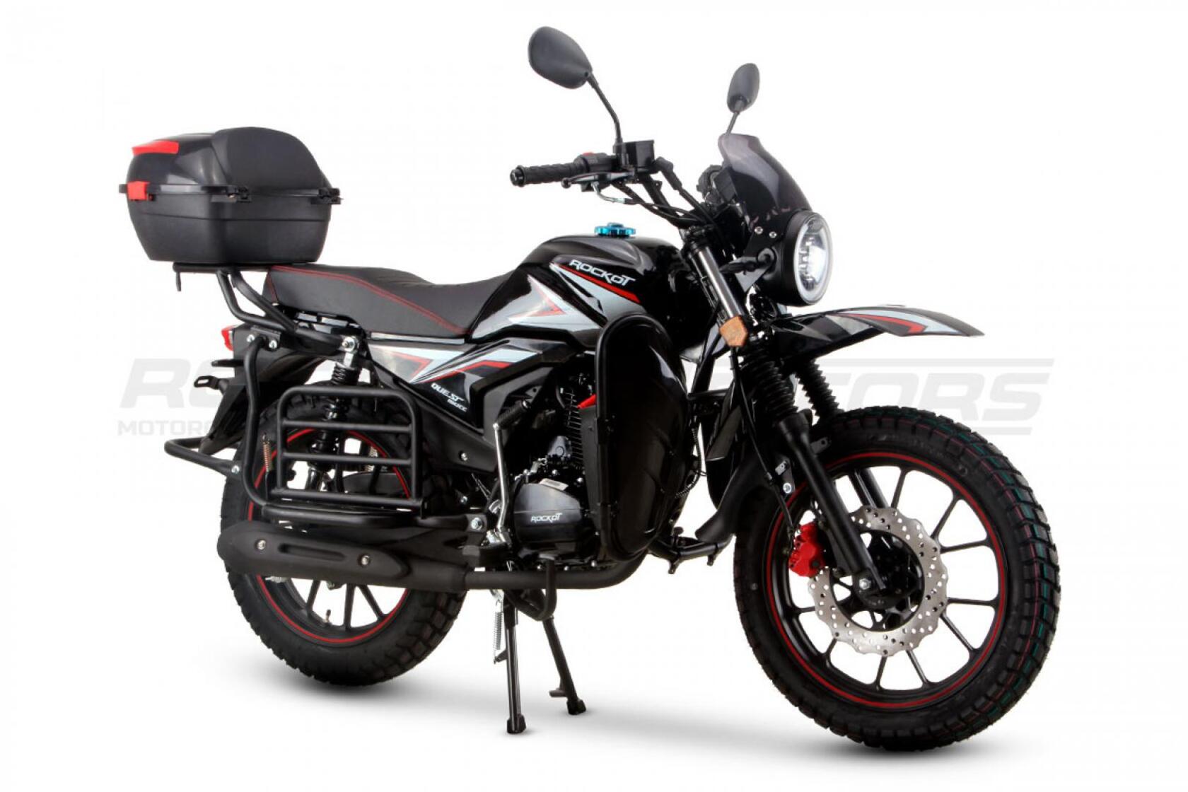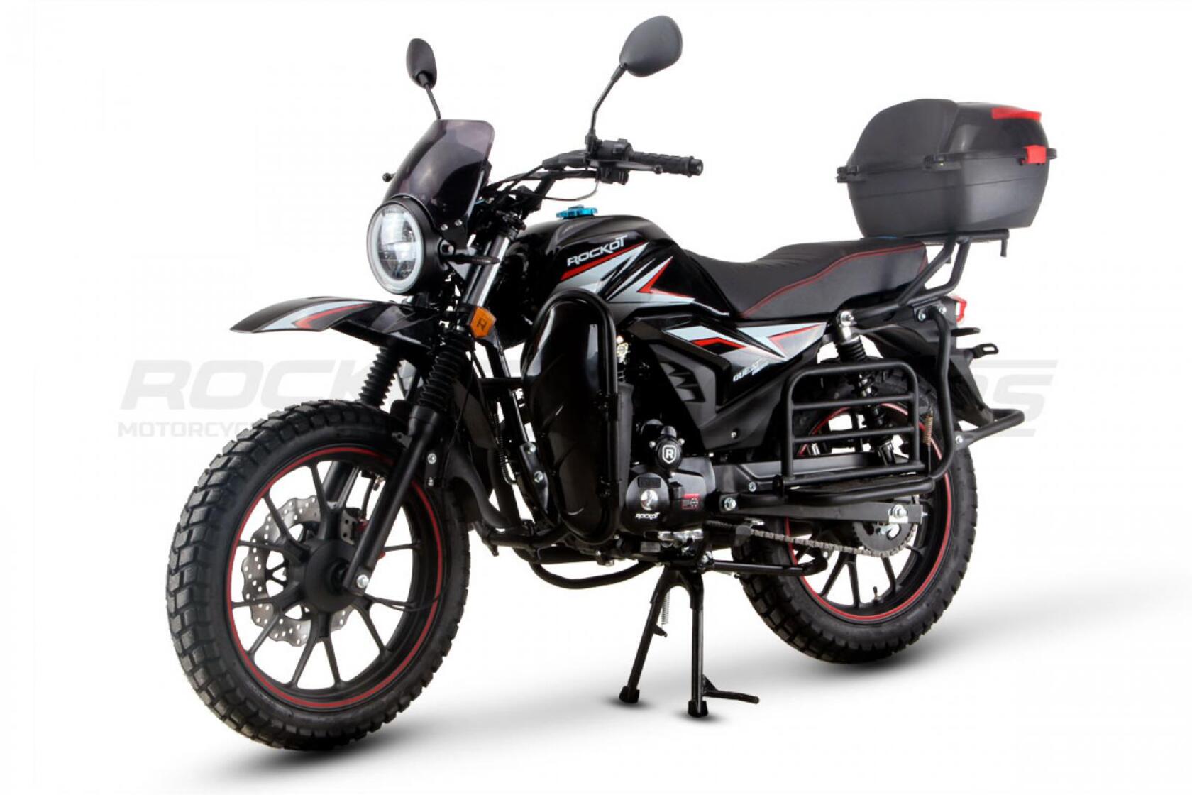 ROCKOT QUEST 150 - новый, дорожный мотоцикл от компании ROCKOT-MOTORS, с большим потенциалом на длительные поездки, независимо от типа дорожного покрытия. Благодаря своим компактным размерам, короткой колесной базе, мотоцикл отлично чувствует себя в городской среде с большим объемом дорожного трафика.. Максимальная скорость ROCKOT QUEST 150 - до 92 км/ч на стандартных приводных звездах. Масса мотоцикла -126 килограмм, но при небольшой высоте по седлу в 820 мм и низкому центру тяжести, он ощущается достаточно легким.Мотоцикл имеет ЭПТС, оснащен цветной электронной панелью приборов, зеркалами, всей необходимой светотехникой, что позволяет законно передвигаться по дорогам общего пользования. ДизайнМотоцикл построен в классическом исполнении, но имеет множество современных, технологичных решений.Все световые приборы - светодиодные и очень яркие. Передняя фара имеет круглую классическую форму, но стоит ее включить, как мотоцикл обретает совершенно другой вид.Цветовая гамма модели имеет три варианта окраски: бело-красный, черный и серый.Конечно же, бросается в глаза оснащение мотоцикла туристической багажной системой. На заднем багажнике установлен жесткий центральный кофр. Откидные боковые багажники, позволяют перевозить объемный груз, а также устанавливать боковые багажные сумки. Глядя на мотоцикл, складывается впечатление, что все его пространство использовано максимально практично. Даже в дугах безопасности встроены дополнительные багажные карманы.Топливная системаВ основе топливной системы ROCKOT QUEST 150 - большой топливный бак объемом 12 литров. В зависимости от условий эксплуатации и стиля езды, расход топлива варьируется в районе 3-3,5 литров на 100 километров. Это позволяет преодолевать большие расстояния на одном баке бензина. Используемый тип топлива - бензин АИ-92. Образует топливную смесь - карбюратор PZ27 с ускорительным насосом. Ускорительный насос исключает момент “провала” при резком открытии дроссельной заслонки.Тормозная системаПо канонам классического мотоциклостроения, ROCKOT QUEST 150 имеет комбинированную тормозную систему. Спереди установлен дисковый гидравлический тормоз, с двухпоршневым суппортом, яркого красного цвета. Задний тормоз - механический, барабанный.Кому подойдет ROCKOT QUEST 150Мотоцикл будет очень полезен новичкам. Его небольшие габаритные размеры, низкий центр тяжести, малая высота по седлу - позволяют быстро освоить технику управления мотоциклом как в условиях города, так и бездорожья. С практичной точки зрения, мотоцикл понравится любителям выезжать на отдых за город. Отличная туристическая подготовка, позволит перевозить все, что Вам может потребоваться во время отдыха.Благодаря заложенной надежности в конструкцию двигателя и мотоцикла - ROCKOT QUEST 150 оценит старшее поколение, для кого требуется простая и надежная техника.