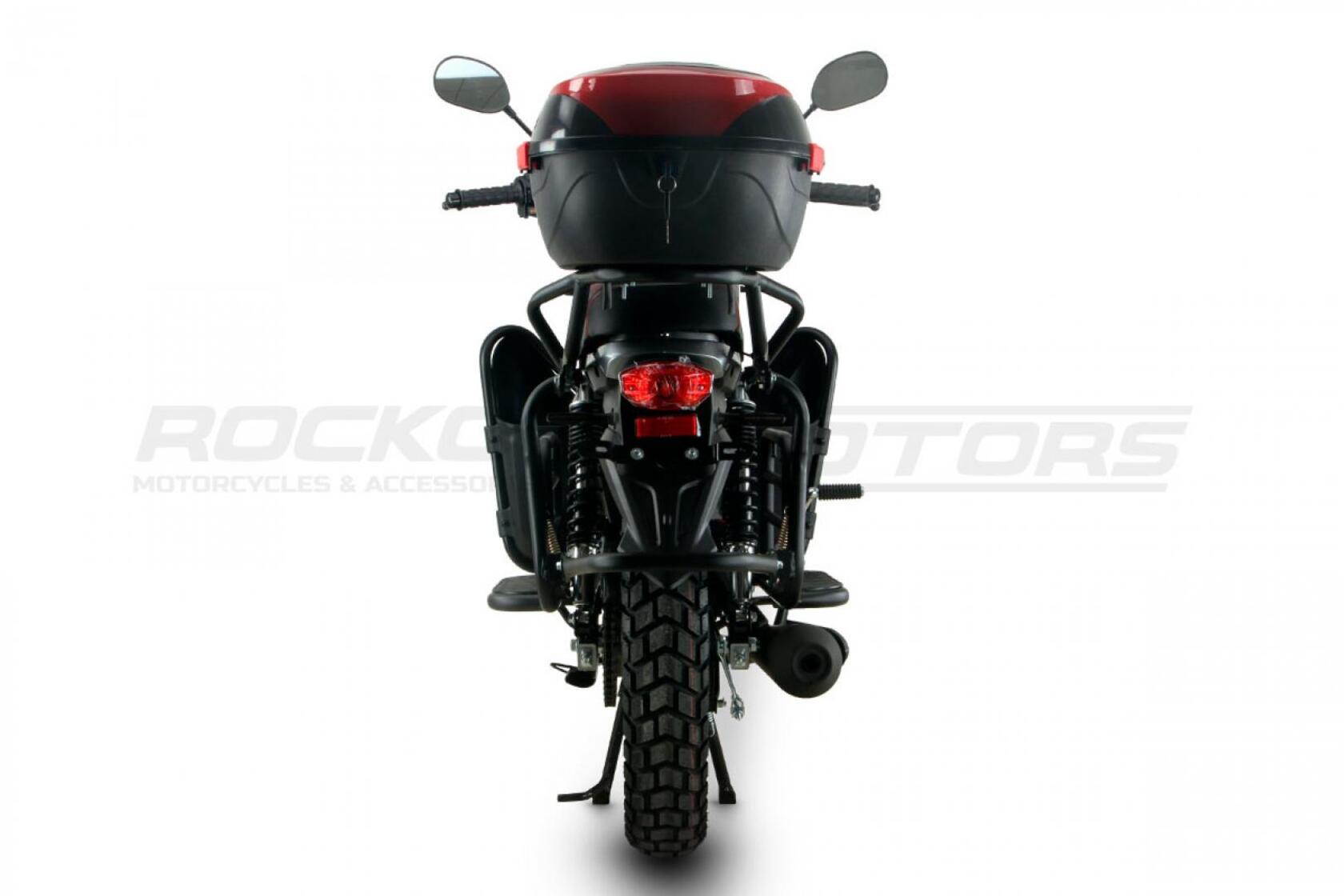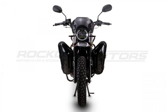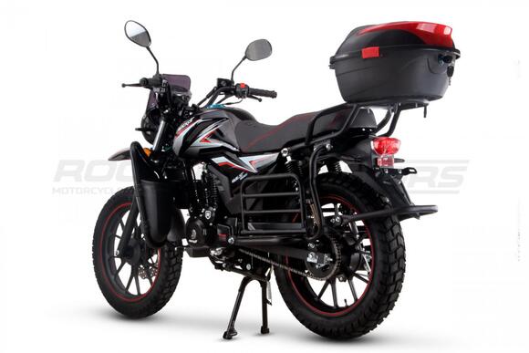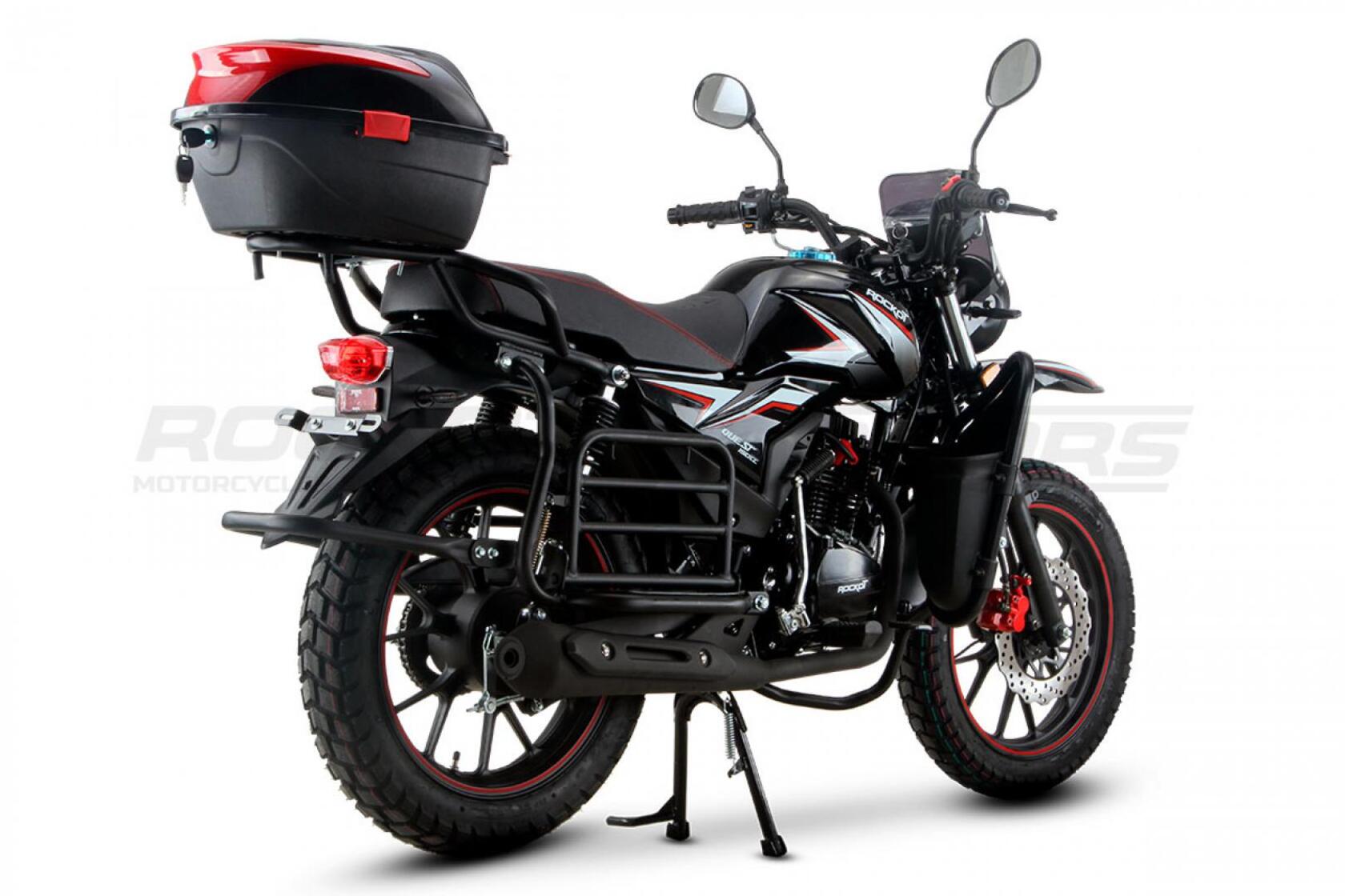 ROCKOT QUEST 150 - новый, дорожный мотоцикл от компании ROCKOT-MOTORS, с большим потенциалом на длительные поездки, независимо от типа дорожного покрытия. Благодаря своим компактным размерам, короткой колесной базе, мотоцикл отлично чувствует себя в городской среде с большим объемом дорожного трафика.. Максимальная скорость ROCKOT QUEST 150 - до 92 км/ч на стандартных приводных звездах. Масса мотоцикла -126 килограмм, но при небольшой высоте по седлу в 820 мм и низкому центру тяжести, он ощущается достаточно легким.Мотоцикл имеет ЭПТС, оснащен цветной электронной панелью приборов, зеркалами, всей необходимой светотехникой, что позволяет законно передвигаться по дорогам общего пользования. ДизайнМотоцикл построен в классическом исполнении, но имеет множество современных, технологичных решений.Все световые приборы - светодиодные и очень яркие. Передняя фара имеет круглую классическую форму, но стоит ее включить, как мотоцикл обретает совершенно другой вид.Цветовая гамма модели имеет три варианта окраски: бело-красный, черный и серый.Конечно же, бросается в глаза оснащение мотоцикла туристической багажной системой. На заднем багажнике установлен жесткий центральный кофр. Откидные боковые багажники, позволяют перевозить объемный груз, а также устанавливать боковые багажные сумки. Глядя на мотоцикл, складывается впечатление, что все его пространство использовано максимально практично. Даже в дугах безопасности встроены дополнительные багажные карманы.Топливная системаВ основе топливной системы ROCKOT QUEST 150 - большой топливный бак объемом 12 литров. В зависимости от условий эксплуатации и стиля езды, расход топлива варьируется в районе 3-3,5 литров на 100 километров. Это позволяет преодолевать большие расстояния на одном баке бензина. Используемый тип топлива - бензин АИ-92. Образует топливную смесь - карбюратор PZ27 с ускорительным насосом. Ускорительный насос исключает момент “провала” при резком открытии дроссельной заслонки.Тормозная системаПо канонам классического мотоциклостроения, ROCKOT QUEST 150 имеет комбинированную тормозную систему. Спереди установлен дисковый гидравлический тормоз, с двухпоршневым суппортом, яркого красного цвета. Задний тормоз - механический, барабанный.Кому подойдет ROCKOT QUEST 150Мотоцикл будет очень полезен новичкам. Его небольшие габаритные размеры, низкий центр тяжести, малая высота по седлу - позволяют быстро освоить технику управления мотоциклом как в условиях города, так и бездорожья. С практичной точки зрения, мотоцикл понравится любителям выезжать на отдых за город. Отличная туристическая подготовка, позволит перевозить все, что Вам может потребоваться во время отдыха.Благодаря заложенной надежности в конструкцию двигателя и мотоцикла - ROCKOT QUEST 150 оценит старшее поколение, для кого требуется простая и надежная техника.