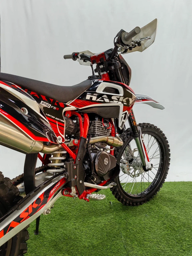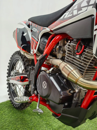 Для истинных ценителей мотоспорта компания Hasky представляет специальную версию своего флагмана – F5 Racing Limited Edition. Этот среднеразмерный эндуро-байк с колесной формулой 21/18 дюймов создан для тех, кто требует от техники максимальной отдачи и надежности в экстремальных условиях.В основе мотоцикла лежит двигатель Loncin 166 YB250R, работающий в паре с 5-ступенчатой коробкой передач. Спортивный карбюратор Nibbi PE 30 Race обеспечивает мгновенную реакцию на ручку газа, а электростартер гарантирует беспроблемный запуск в любых условиях. Подвеска профессионального уровня включает передние амортизаторы HTW с диаметром пера 43 мм и задний моноамортизатор той же марки, что обеспечивает превосходную управляемость на сложном рельефе.Мотоцикл оснащен усиленными алюминиевыми ободами Unison 7016, покрышками Soft (120/90-18 сзади и 80/100-21 спереди) и специальными камерами с усиленной 3-мм стенкой. Руль из высокопрочного сплава 7075 в сочетании с эргономичными грипсами Lock-on обеспечивает полный контроль над байком. Особого внимания заслуживает система безопасности: влагозащищенная проводка, складной рычаг сцепления на 360, защита рук и мощная светодиодная фара с пятью линзами.