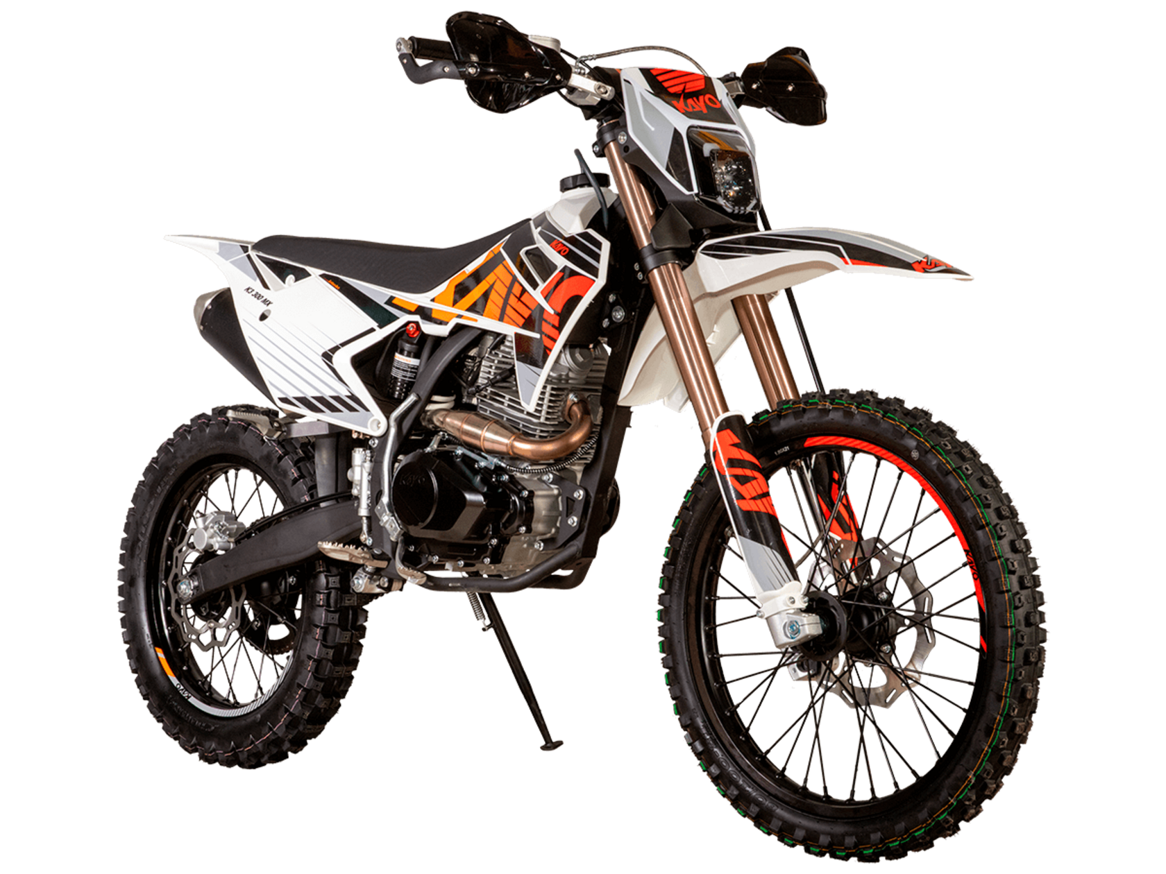 Мотоцикл KAYO K3 300 MX 21/18 2025 – эндуро мотоцикл, который пришёл, чтобы стать новым хитом среди среднеразмерных моделей!Мотоцикл оснащён одноцилиндровым 4-тактным двигателем ZONGSHEN PR300/ZS175FMM-5 объёмом 271,3 см³ с балансирным валом и воздушным типом охлаждения. Максимальная мощность в 21,75 л.с. достигается при 8500 об/мин, а максимальный крутящий момент 22 Нм при 6500 об/мин. Соотношение диаметра и хода поршня 75,0х61,4. Степень сжатия 9,29:1. Карбюратор NIBBI PE30 обеспечивает топливную экономность и бесперебойную работу в самых сложных заездах. На мотоцикле установлена 5-ступенчатая коробка передач и цепной привод. Запуск двигателя осуществляется с помочью электростартера или кикстартера. Объём топливного бака 10 литров.Спицованные колёса с алюминиевыми ободами имеют диаметр 21 дюйм спереди и 18 сзади. Для подвески спереди используется телескопическая вилка перевёрнутого типа длиной 830 мм, а сзади установлен моноамортизатор длиной 450 мм. Оба компонента регулируются. На мотоцикле установлены гидравлические дисковые тормоза с 2-поршневой системой спереди и однопоршневой сзади.Мотоцикл готов к самым суровым вызовам бездорожья. Удобное расположение фильтр-бокса позволяет легко обслуживать его после заездов. Руль оснащён алюминиевой защитой рук с высокими пластиковыми накладками. На мотоцикле используются ручки-«неломайки» с регулировкой положения рычага и короткоходная ручка газа.Габариты 2100х810х1180 мм, вес 109 кг. Клиренс 340 мм, колёсная база 1390 мм, высота по седлу 900 мм.