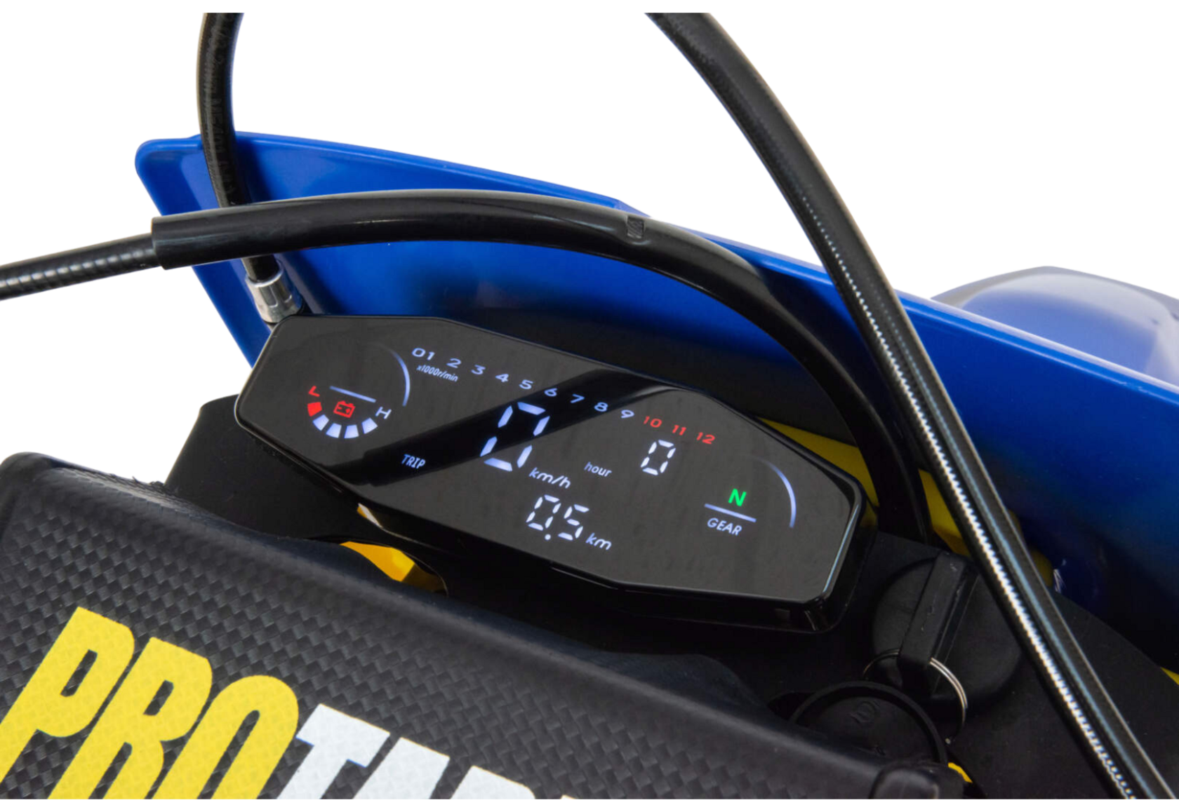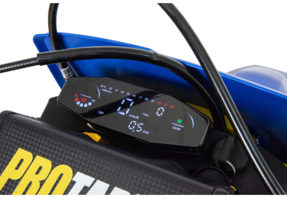 Габариты (2100×800×1250 мм) и база по осям 1460 мм обеспечивают отличный баланс между устойчивостью и поворачиваемостью. Высота по седлу — 950 мм, а высота до руля увеличена до 1230 мм, что даёт более вертикальную и агрессивную посадку, характерную для профессиональных кроссовых моделей.