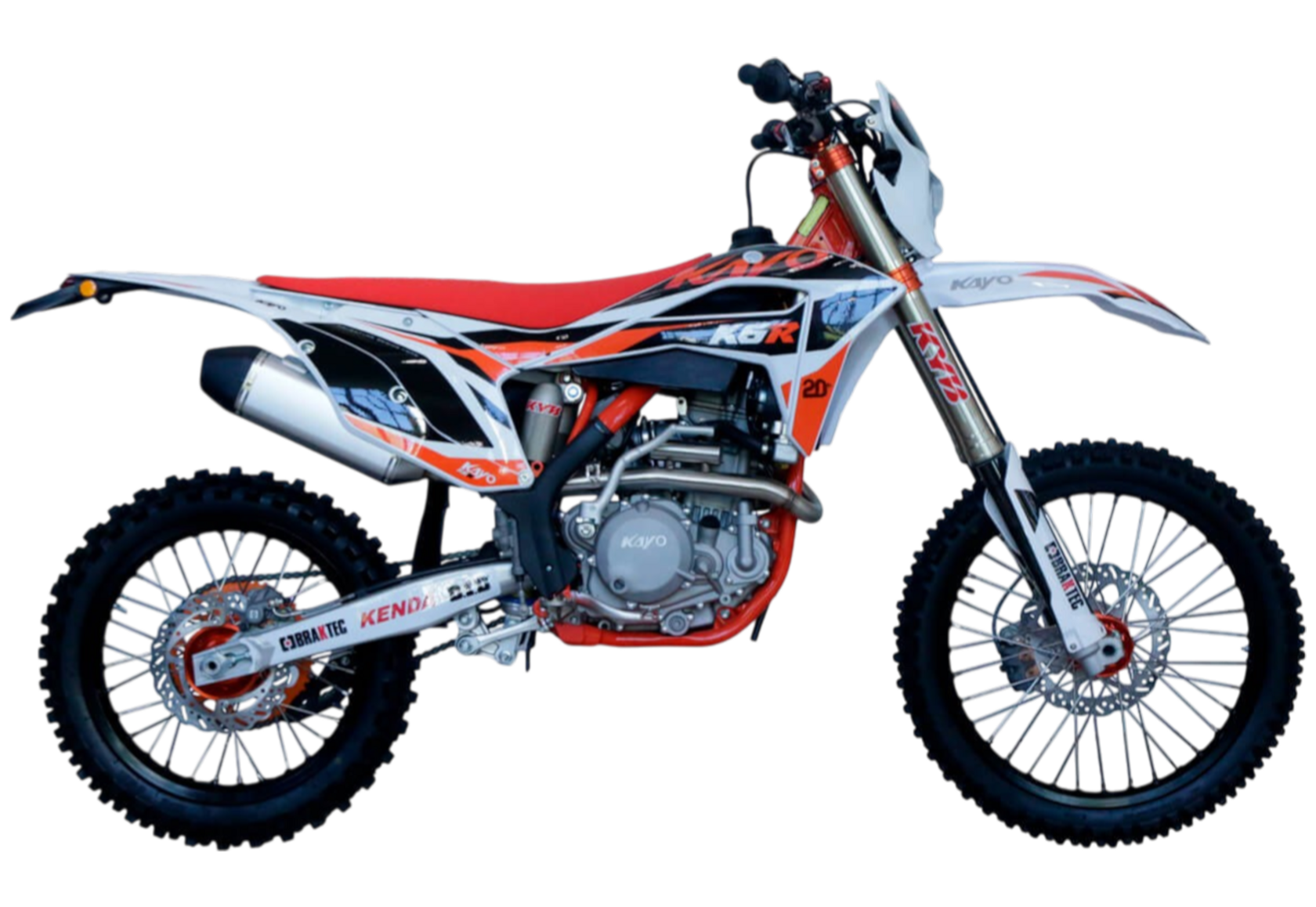 Мотоцикл KAYO K6-R KYB 250 – идеальный снаряд для внедорожного экстрима, представляющий собой оптимальный баланс производительности и технической оснащённости, поэтому он идеально подходит как новичкам, так и опытным райдерам. Удобный, простой и надёжный мотоцикл, который полностью оправдывает свою цену.Мотоцикл оснащён одноцилиндровым 4-тактным 4-клапанным двигателем (NC250SR ZS177MM-B) с двумя распредвалами и объёмом 250 см3, который обеспечивает высокую мощность (36 л.с.) и крутящий момент, что позволяет развивать большую скорость и с лёгкостью преодолевать трассы со сложным рельефом. Карбюратор FCR MX 41 обеспечивает бесперебойную работу техники в самых жёстких условиях эксплуатации, простоту и лёгкость в обслуживании, а также неприхотливость к качеству топлива. Жидкостная система охлаждения не допустит перегрева мотора даже при самом агрессивном вождении. Двигатель работает в паре с 6-ступенчатой механической коробкой передач с классической схемой “1-N-2-3-4-5-6”. Аппарат оснащён системой запуска двигателя при помощи кнопки электростартера или при помощи рычага кик-стартера.Усиленная рама из хром-молибденового сплава разработана фирмой KAYO. Передняя подвеска — регулируемая телескопическая вилка перевёрнутого типа длиной 950 мм, задняя — регулируемый моноамортизатор 480 мм с прогрессией, рассчитанный на высокие нагрузки. Оба компонента подвески произведены знаменитой фирмой KYB (KAYABA). В паре они позволяют эффективно амортизировать удары при езде по неровностям и препятствиям на трассе. Мотоцикл оснащён классическими спицованными колёсами диаметром 18 дюймов сзади и 21 дюйм спереди. Они имеют усиленные обода из алюминиевого сплава марки 7050, лёгкие ступицы из фрезерованного алюминия, усиленные 4-миллиметровые спицы, буксаторы и качественные покрышки известного шинного бренда KENDA. Эффективное и безопасное замедление с любых скоростей обеспечивают гидравлические дисковые тормоза от фирмы BRAKTEC с тормозными рычагами PRO CAKEN.Мотоцикл достаточно компактен и имеет вес всего в 114 кг, поэтому он комфортен в эксплуатации одновременно и для мужчин среднего телосложения, и для девушек.Высококачественная износостойкая резина с развитым протектором отлично держит дорогу на различных типах покрытия и в самых разных поворотах. Сиденье эргономичной формы покрыто антискользящим материалом. Данная модель укомплектована очень яркой фарой со светодиодным модулем, которая позволяет кататься и в ночное время.K6-R KYB 250 сочетает в себе отличные технические характеристики, комфорт и надёжность, что позволяет вам ощутить настоящую свободу на любой трассе.