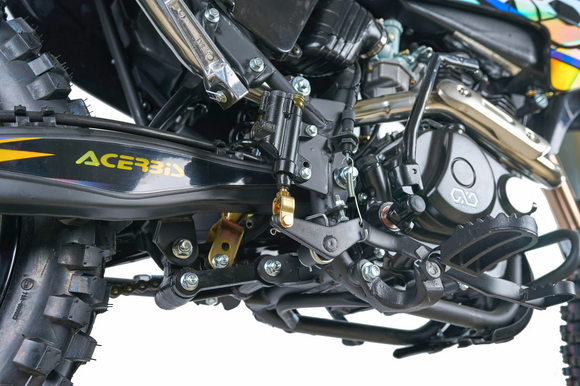 ДвигательДвигатель ZS165FMM - 4-тактный двигатель воздушного охлаждения объёмом 223 куб см с двумя клапанами, оснащён балансировочным валом, благодаря которому уменьшается избыточная вибрация, передаваемая от двигателя на раму и общую конструкцию техники. Характеризуется хорошей тягой с самых низов и лёгким пуском с помощью электростартера. Двигатель отлично зарекомендовал себя в качестве надёжного, универсального, неприхотливого мотора с хорошими характеристиками.РамаРама мотоцикла OXO производится из труб шестигранного сечения хром-молибденовой стали, которая является очень прочной и легкой. Геометрия рамы, благодаря правильно выверенному центру тяжести и углу наклона вилки - способствует наилучшей управляемости устойчивости мотоцикла на низкой скорости.ПодвескаПередняя вилка перевернутого типа. Мотоцикл LITE 250 снабжен моноамортизатором, который соединен посредством системы рычагов прогрессии. Система прогрессии, обеспечивает равномерную, мягкую работу и увеличивает длину рабочего хода подвески.КолесаРазмер передней покрышки: 80/100-21. Размер задней покрышки: 120/100-18. Они прекрасно себя ведут по песку и грязи, что позволяет райдеру отлично показать себя на пересеченной местностиТормозная системаТормозная система мотоцикла - полностью гидравлическая с армированными шлангами. Спереди и сзади установлен двухпоршневой суппорт. Данная конфигурация тормозных механизмов, позволит быстро и безопасно остановиться с максимальной скорости даже на бездорожье.РульВажная часть современного эндуро мотоцикла - усиленный руль переменного сечения Мотоцикл укомплектован панелью приборов..