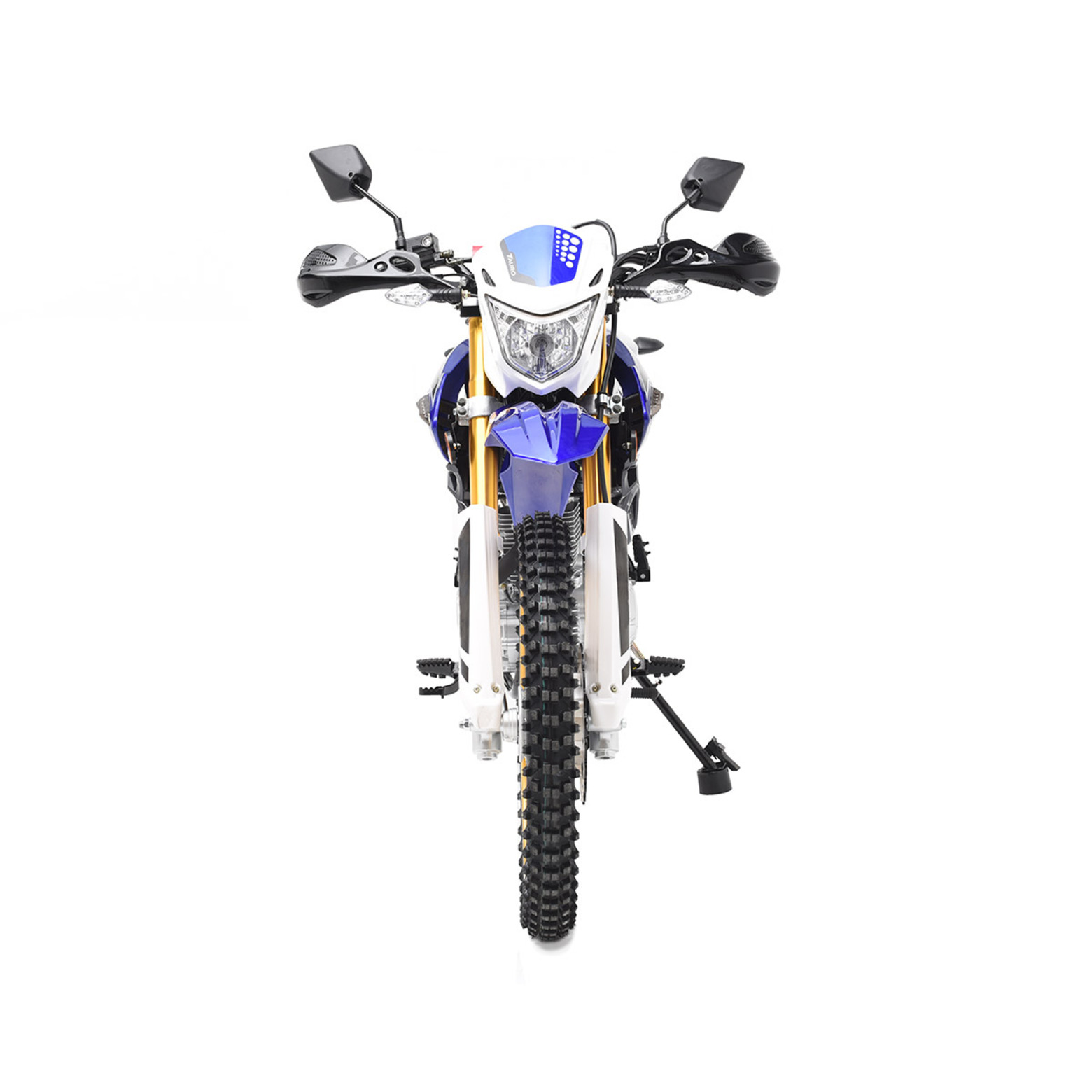 Regulmoto SK 250GY-5 – мотоцикл двойного назначения, созданный для эксплуатации как на дорогах общего пользования, так и на легком бездорожье. Топовая модель линейки лайт-эндуро мототехники известного китайского производителя Senke отличается высокой надежностью повседневной эксплуатации, отсутствием сложностей в сервисном обслуживании, простотой и легкостью управления.В надежной раме с защитными дугами Regulmoto SK 250GY-5 установлен 4-тактный одноцилиндровый двигатель с рабочим объемов в 250 см3, демонстрирующий максимальную мощность в 18 л.с. при 7000 оборотах в минуту и максимальный крутящий момент в 16,5 Hm при 5500 оборотах в минуту. Мотор с воздушным охлаждением, в котором можно без труда признать реплику двигателя известного японского производителя, оснащается балансировочным валом, что позволяет избавиться от излишней вибрации.Подвеска мотоцикла на колесах 21/18 дюймов со стальными ободьями представлена телескопической вилкой-перевертышем спереди, перья которой закрыты защитой, и стальным маятником с моноамортизатором сзади. Тормоза у мотоцикла дисковые, спереди установлен 4-поршневой суппорт, сзади – 2-поршневой.Оснащение Regulmoto SK 250GY-5 соответствует возлагаемым на мотоцикл эксплуатационным задачам: на байке вполне комфортно передвигаться по дорогам и легкому бездорожью, чему способствуют достаточно большой ход амортизаторов, защита цепи, пластиковая защита рук. Среди установленного оборудования присутствуют: аналоговая приборная панель, замок зажигания с защитой от попадания песка и пыли, полный комплект светового оборудования с дополнительными светодиодными поворотниками, встроенными в боковые обтекатели, зеркала заднего вида, стояночная и центральная подножки.Данная модель мотоцикла присутствует на отечественном рынке мототехники уже достаточно длительное время, за которое мотоцикл зарекомендовал себя легким в эксплуатации и неприхотливым в обслуживании аппаратом. О высокой надежности мотоцикла говорят солидный километраж пробегов при отсутствии серьезных неисправностей и позитивные отзывы обладателей Regulmoto SK 250GY-5.