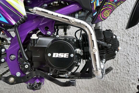 Питбайк BSE MX125 17/14 Purple Dragon обладает всеми качествами спортивного мини-мотоцикла, богатой комплектацией и большим выбором цветов. Питбайк BSE MX 125 - отличный выбор для тех, кто делает первые шаги в мире спорта, кросса и офф-роада. В оригинальной, усиленной, хромомолибденовой раме BSE, устанавливается мощный 4-х тактный двигатель Zonghshen 125 куб см с воздушным охлаждением и 4-ступенчатой коробкой, в рабочем тандеме с спортивным карбюратором Jingke PZ26 способный развивать мощность 10 лошадиных сил. Удлиненная колесная база и превосходная подвеска увеличивает курсовую устойчивость питбайка и позволяет райдеру с большим комфортом управлять им на прямых участках трассы и с легкостью проходить "острые" повороты и подъёмы и любые неровности. Мощная тормозная система HSK Racing c армированными тормозными шлангами. Подвеска питбайка базируется на традиционном выборе комплектующих: телескопическая вилка-«перевертыш» впереди и моноамортизатор сзади. Настройки отбоя/сжатия имеются только у заднего амортизатора, работа вилки корректируется заменой масла. MX 125 укомплектован резиной с увеличенным грунтозацепом, фильтрбоксом, короткоходной ручой газа.
