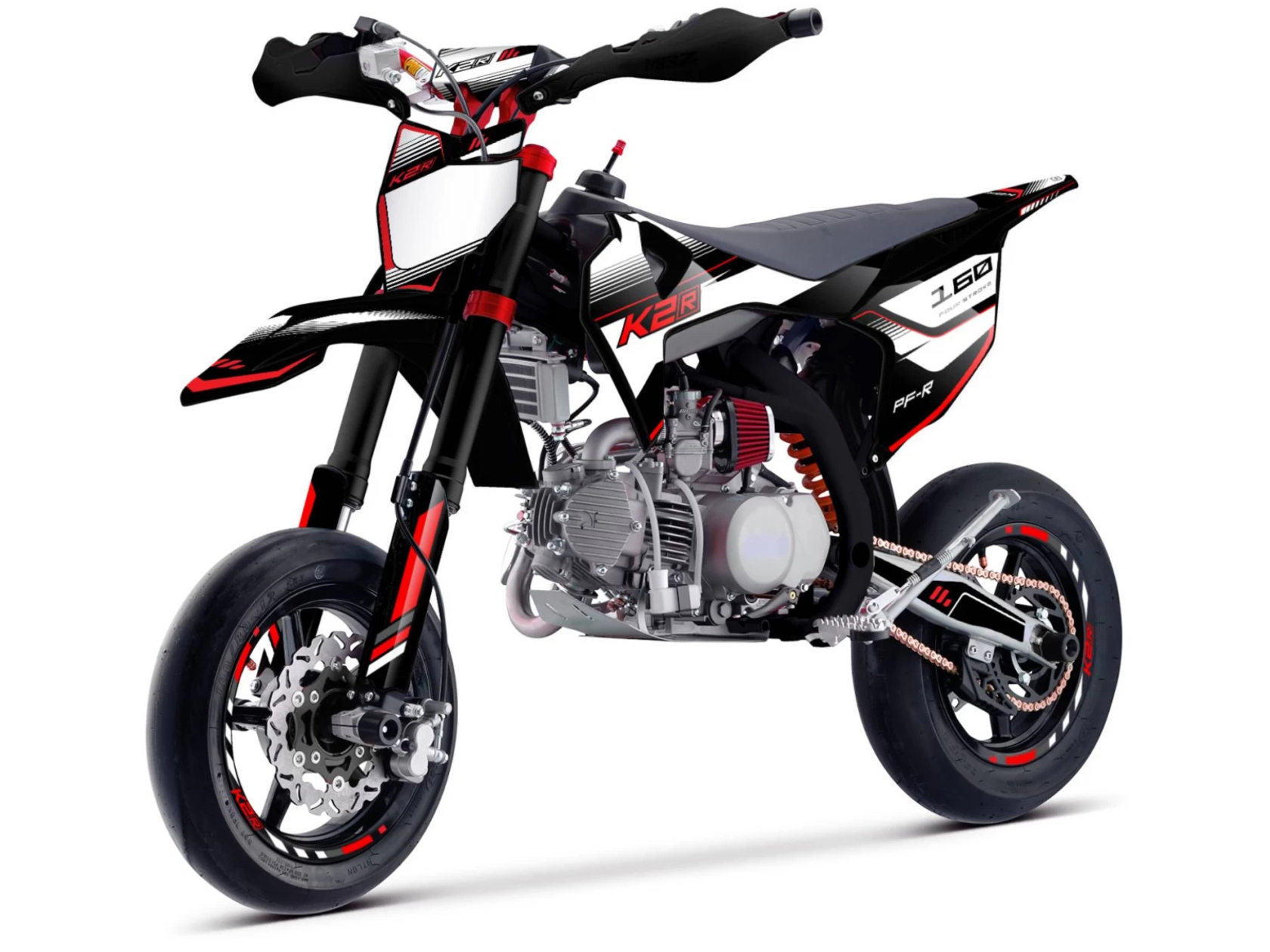 K2R PF-R 160 – полностью готовый к тренировкам и гонкам минимотард.В раме питбайка установлен надежный 1-цилиндровый двигатель, работающий с 4-ступенчатой КПП;12-дюймовые литые колесные диски;перевернутая регулируемая вилка;полностью регулируемый DNM амортизатор; высота сиденья составляет 800 миллиметров;дорожный просвет равен 270 мм.