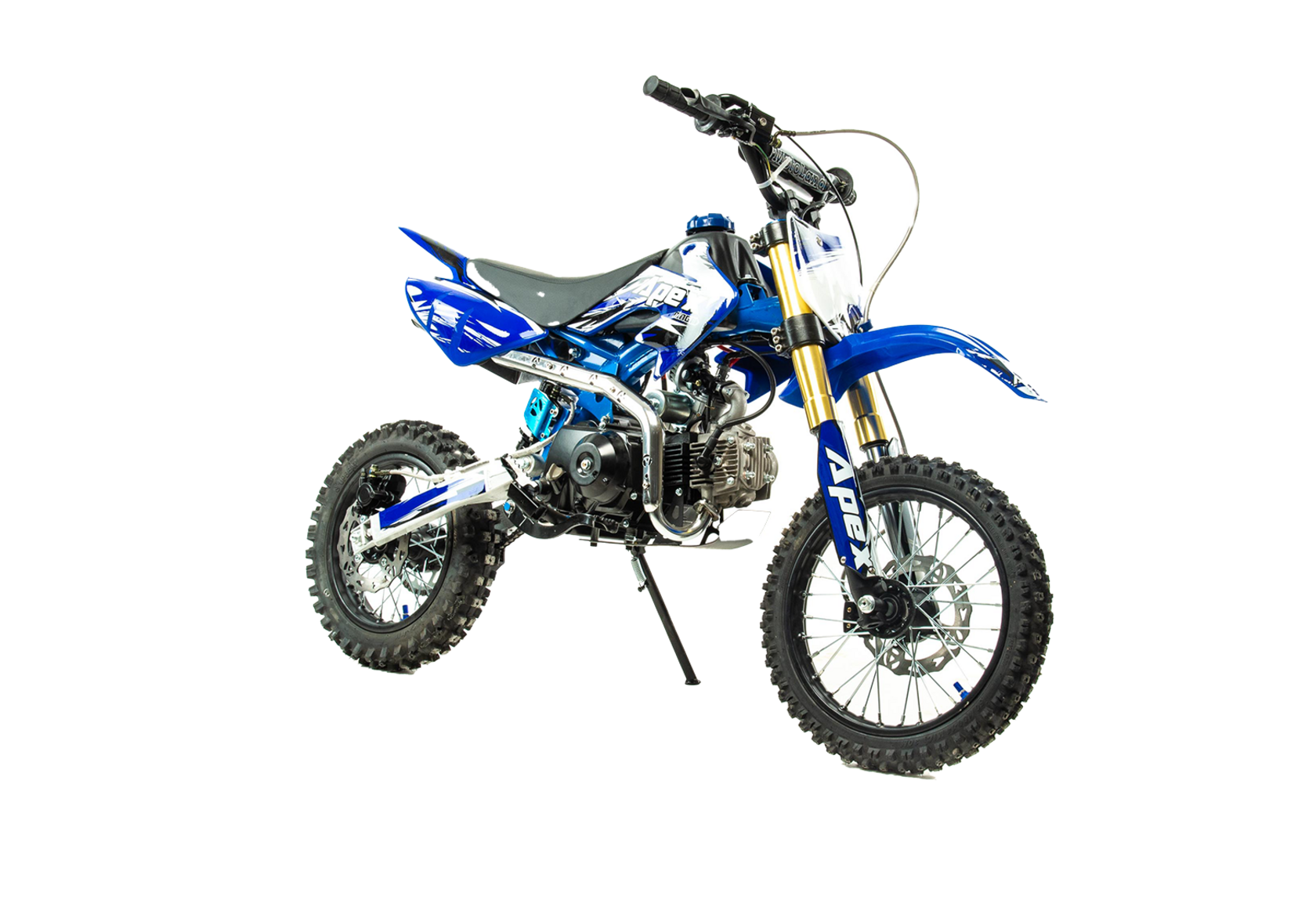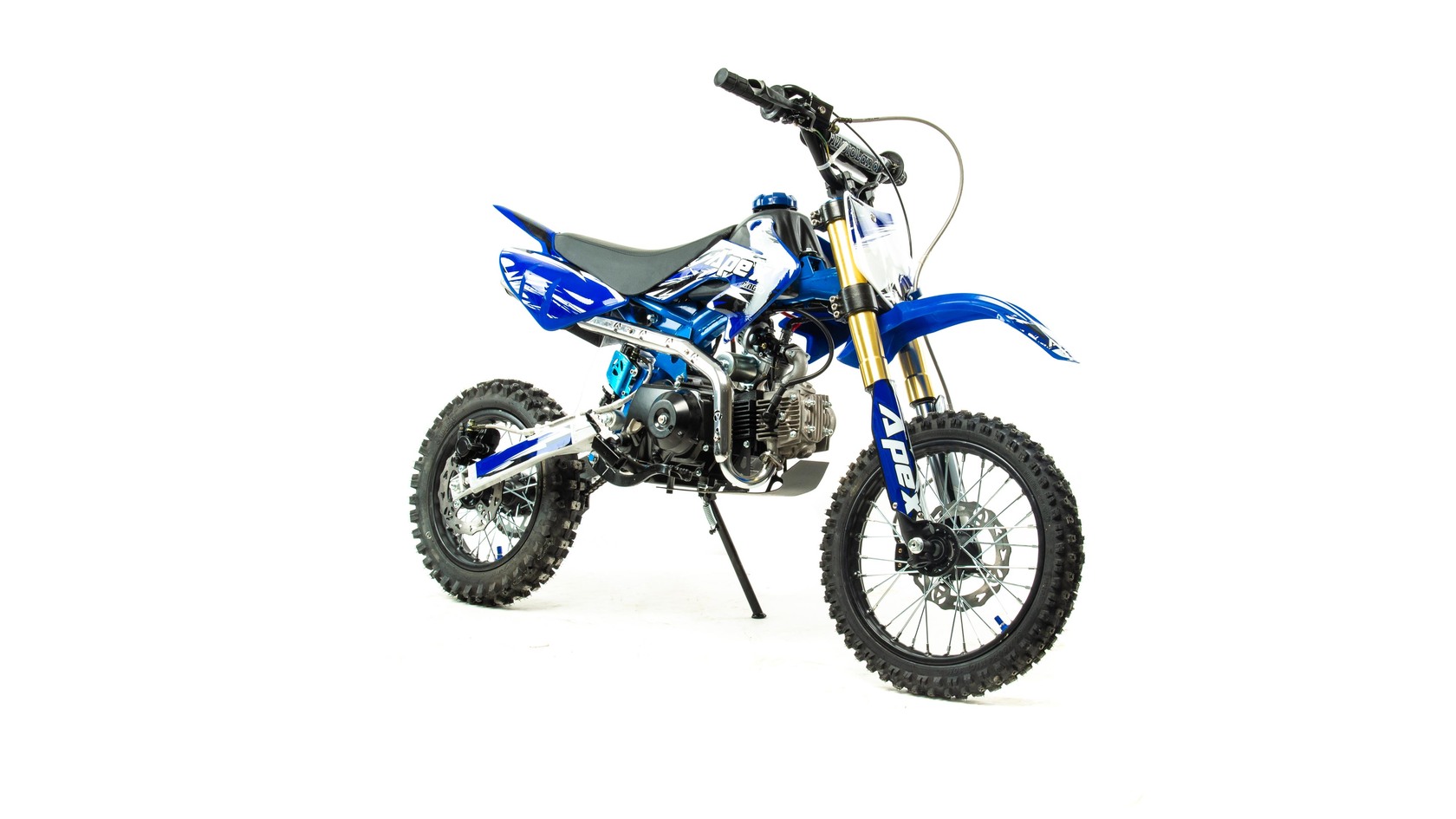 едорогой надёжный питбайк APEX10 идеален для поездок по грунтовым дорогам и бездорожью для детей которые уже научились ездить на маленьких мотоциклах объемом 50 куб.см. Хорошо чувствует себя на мягком и среднем грунте, разгоняется до 70 км/ч. Оснащён CNC траверсами, фарой, алюминиевыми ободами, весит всего 65 кг. Питбайк прост в управлении и не требует специального ухода.У кроссового мотоцикла APEX10 отличный узнаваемый дизайн. Конструкция подчёркивает неуступчивый спортивный характер питбайка, который не остановится ни перед одним препятствием. Пластик комбинированный, прочный, не ломается при сгибании. Кроссовый мотоцикл APEX10 доступен в красном и синем цвете, при этом в основной цвет окрашен не только пластик, но и обода колёс и другие детали питбайка.Передняя подвеска — телескопическая нерегулируемая вилка перевёрнутого типа, которая отлично подходит для преодоления ям, ухабов и других неровностей плохих дорог или их отсутствия. Задняя подвеска маятниковая с моноамортизатором. Руль 22 мм с высоким подъёмом и перекладиной удобен для мотоциклистов разного роста. Питбайк оснащён складными рычагами сцепления и переднего тормоза, а также CNC-лапкой переключения передач.Питбайк весит всего 65 кг, при этом выдерживает вес до 120 кг. Оснащён CNC траверсами, рама полудуплексная стальная, мотоцепь качественная. Колёса спицованные, сделаны из прочного и лёгкого алюминия. Размер заднего колеса — 12 дюймов, переднего — 14 дюйм. Тормоза дисковые, передний тормозной суппорт двухпоршневой, задний — однопоршневой.Питбайк оснащён карбюратором с фильтром нулевого сопротивления VM22 MIKUNI и одноцилиндровым четырёхтактным двигателем с воздушным охлаждением. Надёжный мотор мощностью 8 л. с. и объемом 110 см³ разгоняет кроссовый мотоцикл APEX10 до 70 км/ч. Коробка передач автоматическая, четырёхступенчатая. Система зажигания электронная (CDI), для запуска двигателя можно использовать кикстартер. Сверхпроходимость Покрышки с шипами и высоким грунтозацепом идеальны для бездорожья. Мощность мотора и небольшой вес питбайка позволяют ему преодолевать значительные препятствия и непролазную грязь, хорошо заходить в подъёмы.В случае самовывоза оплата товаров производится в кассе магазина. Если товар доставляется курьером, то оплата осуществляется наличными курьеру в руки. При получении товара обязательно проверьте комплектацию товара, наличие договора купли продажи и чека.