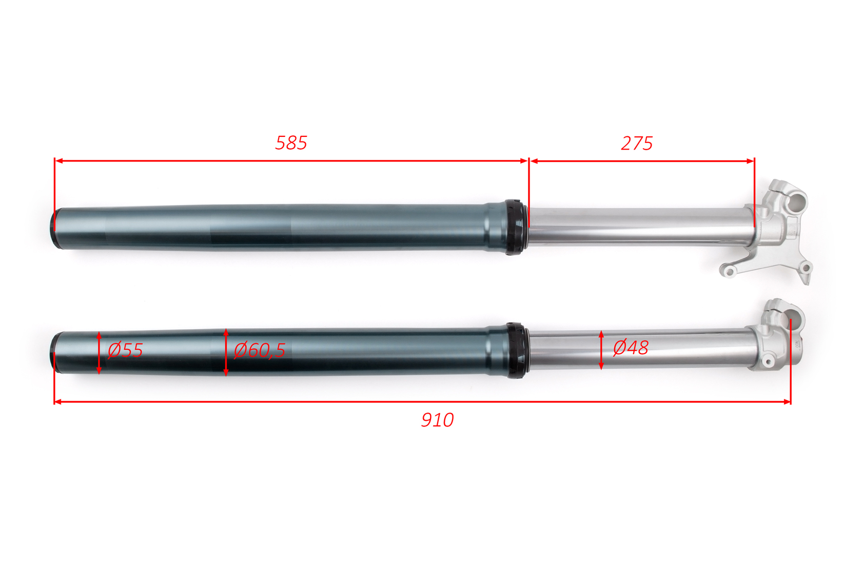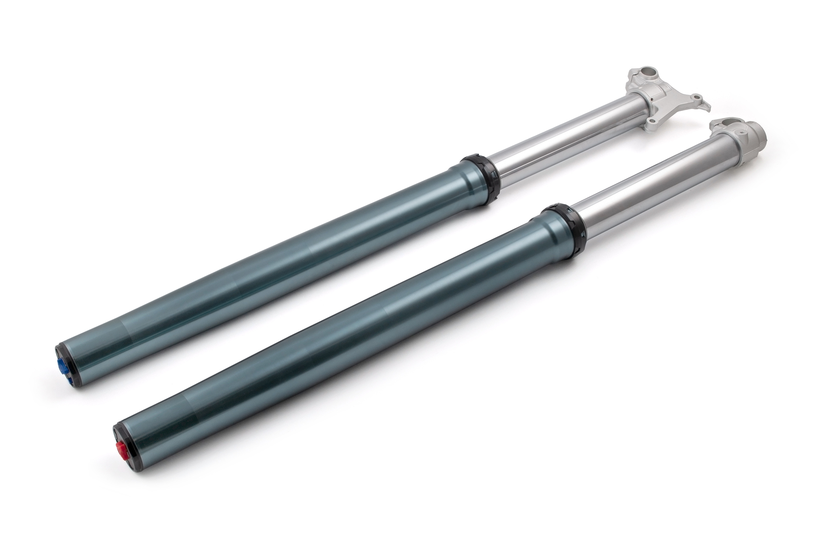 Перья вилки для полноразмерных эндуро мотоциклов с шасси К8. Длина 910 мм, диаметр пера 48 мм. Однокартриджная конструкция с регулировками сжатия и отбоя. Имеют клапан для сброса воздуха и крепление под суппорт типа KTM.